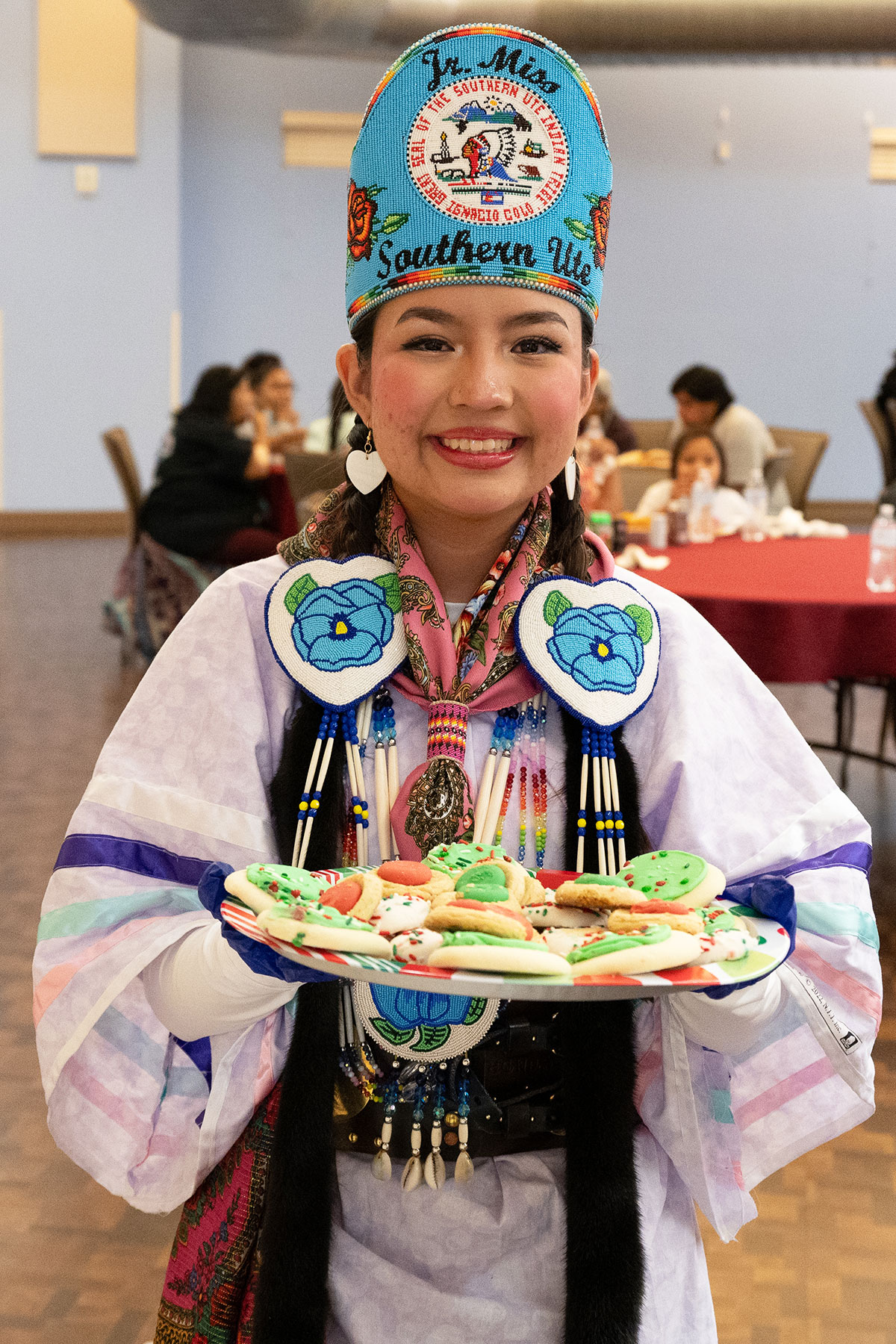 Jr. Miss Southern Ute, Leandra Litz holds a plate of holiday cookies.