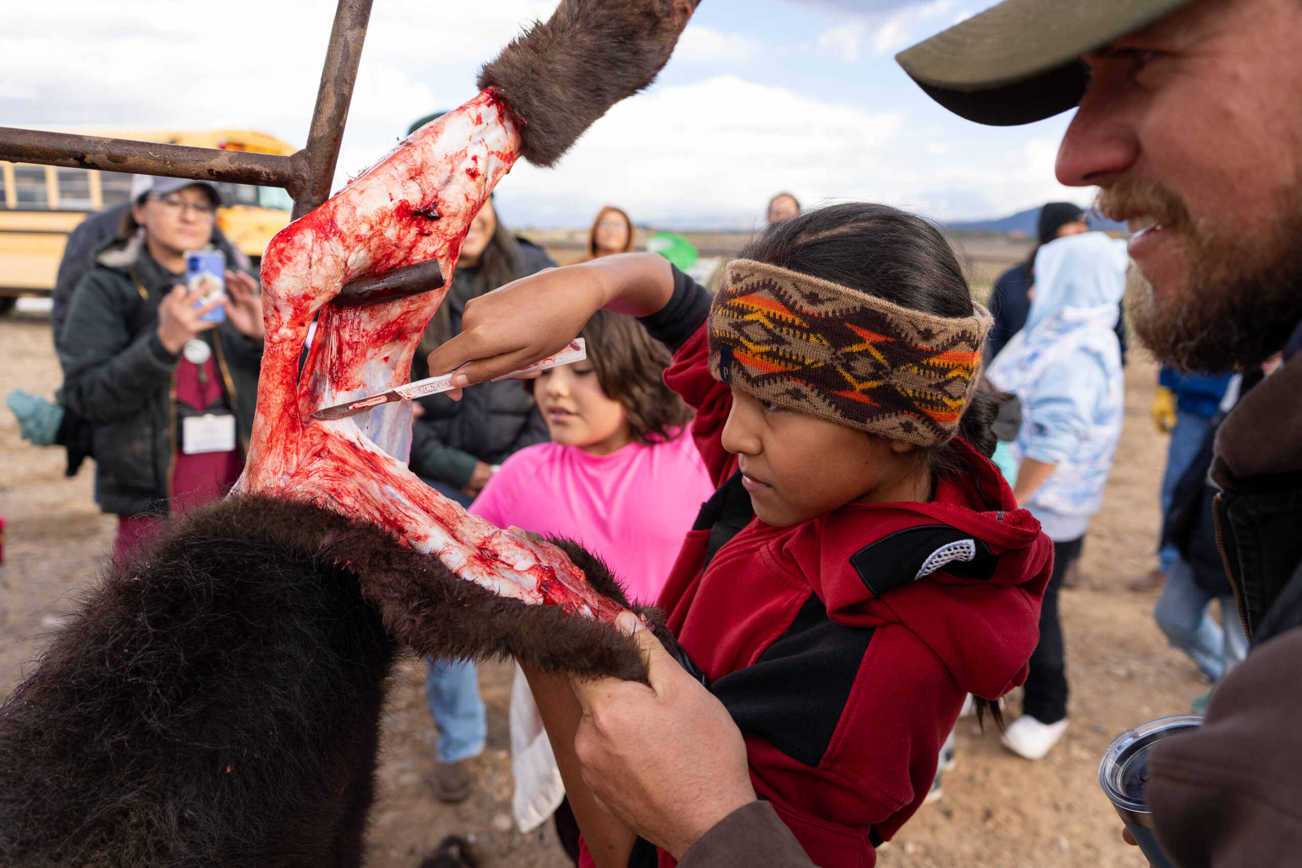 Crisp fall weather brought the annual bison roundup to the Southern Ute Reservation, and the field dressing workshop hosted by the Tribe’s Wildlife Resource Management Division, Thursday, Oct. 23. Students from the Southern Ute Indian Montessori Academy were given the opportunity for hands-on participation in the field dressing process. The event saw parents and teachers join students from the Academy, interested in learning the steps to cleaning and skinning a bull bison once harvested.