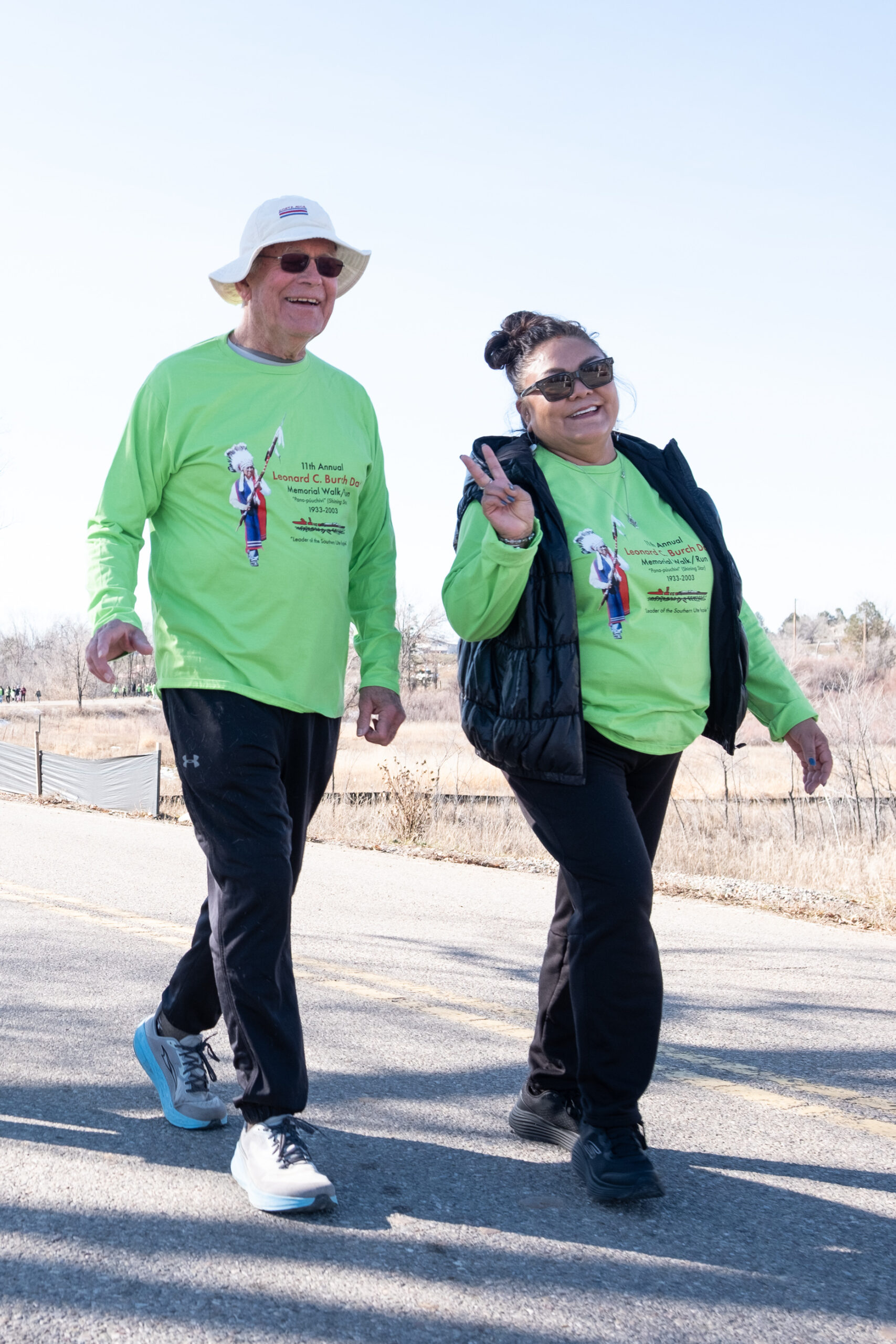 Southern Ute Chairman Melvin Baker and Carol Baker walk together as the Leonard C. Burch Walk-Run makes its way down Ute Road.