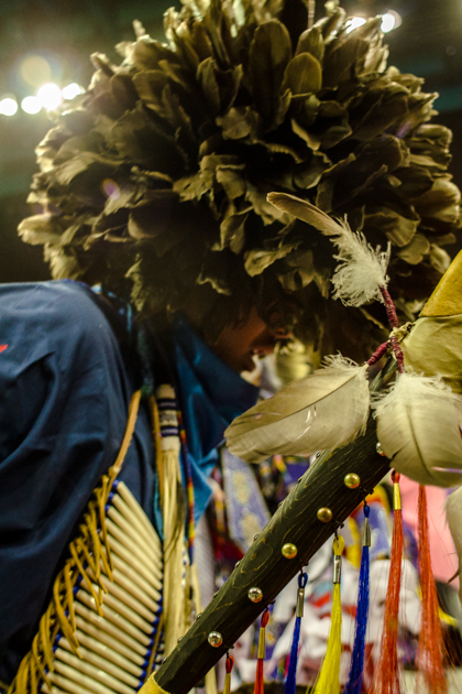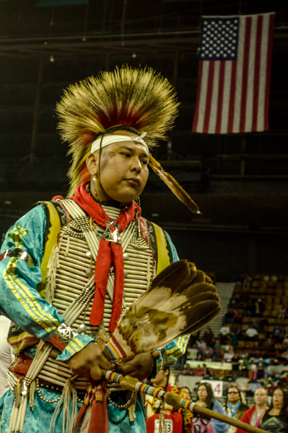 A fancy dancer admires the arena crowd as the venue fills with the sounds of cheers and drum beats.