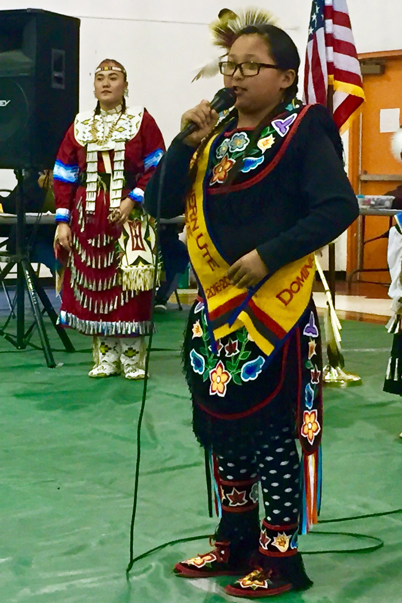 Little Miss Southern Ute Myla Goodtracks introducing herself at the Jicarilla Days Powwow, Friday, Feb. 9 in Dulce, N.M.
