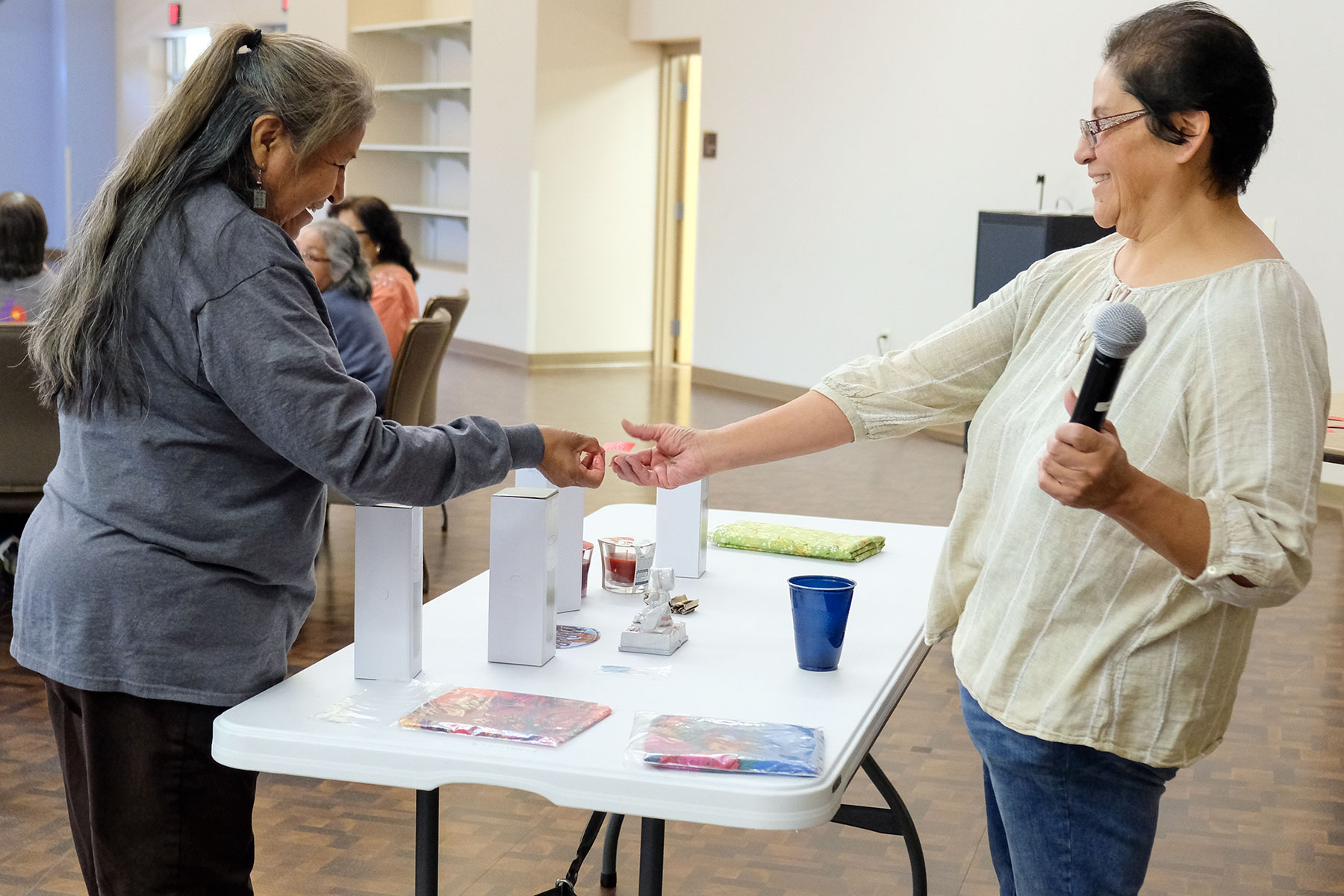 Cynthia Buckskin proudly hands over her winning raffle ticket at May’s Sip, Chat and Chew event, held at the Southern Ute Multi-Purpose Facility, Friday, May 18.