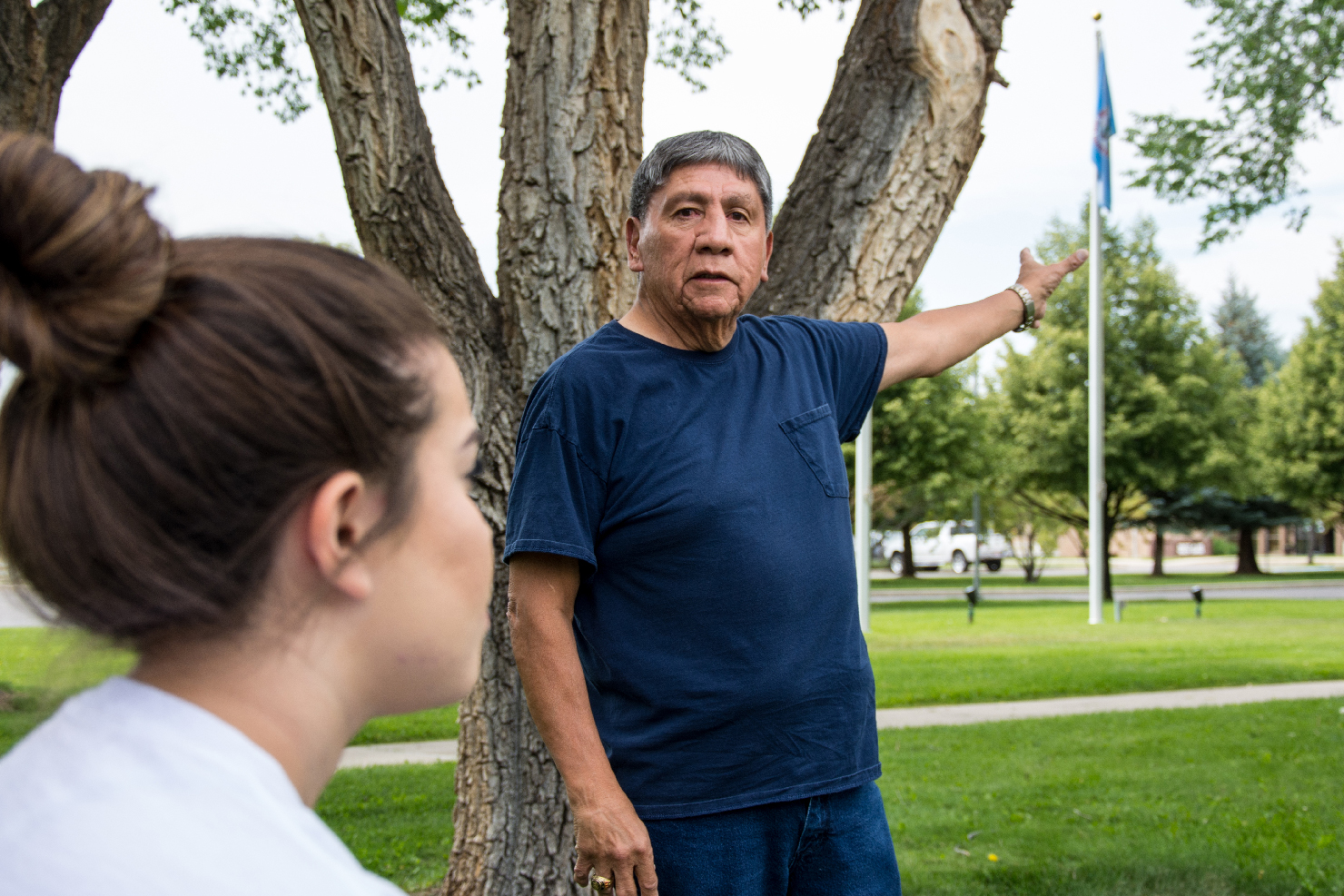 Southern Ute Veteran, Rod Grove tells the history of the Veterans Memorial Park to the summer youth employment workers on Thursday, August 9.