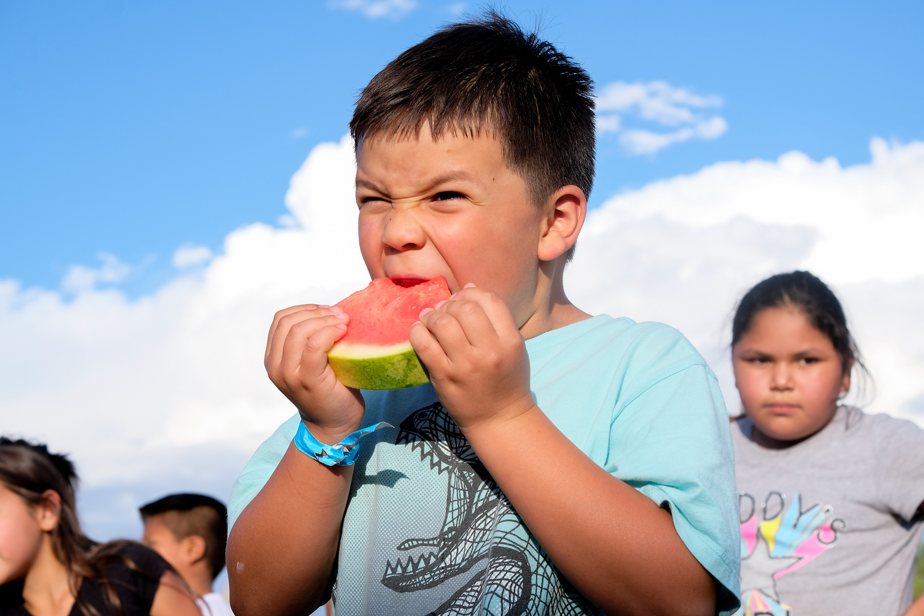 Katelaya Pena competes hard to win the watermelon eating contest at the youth games held at the Southern Ute Multi-Purpose Field.