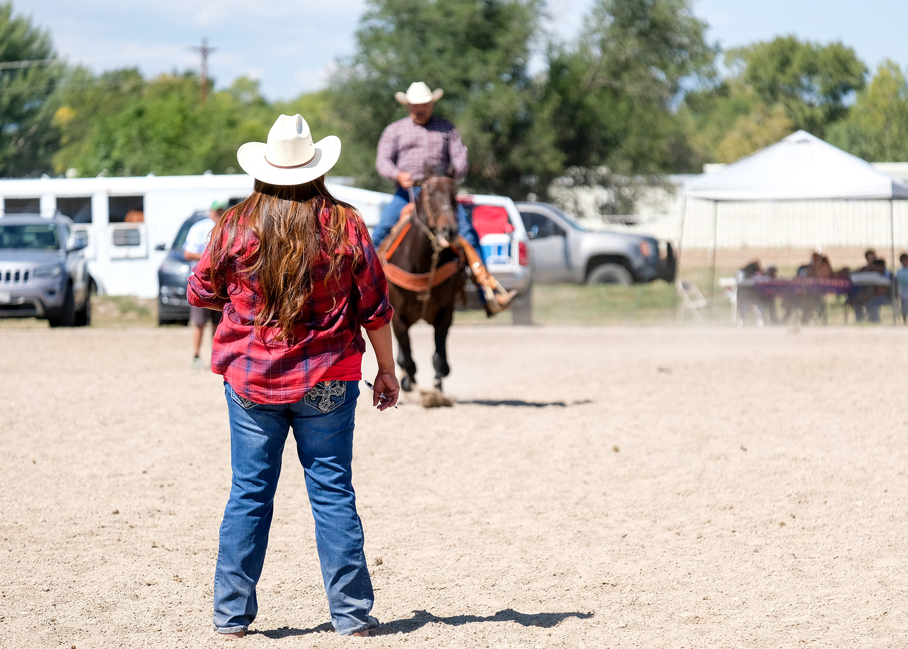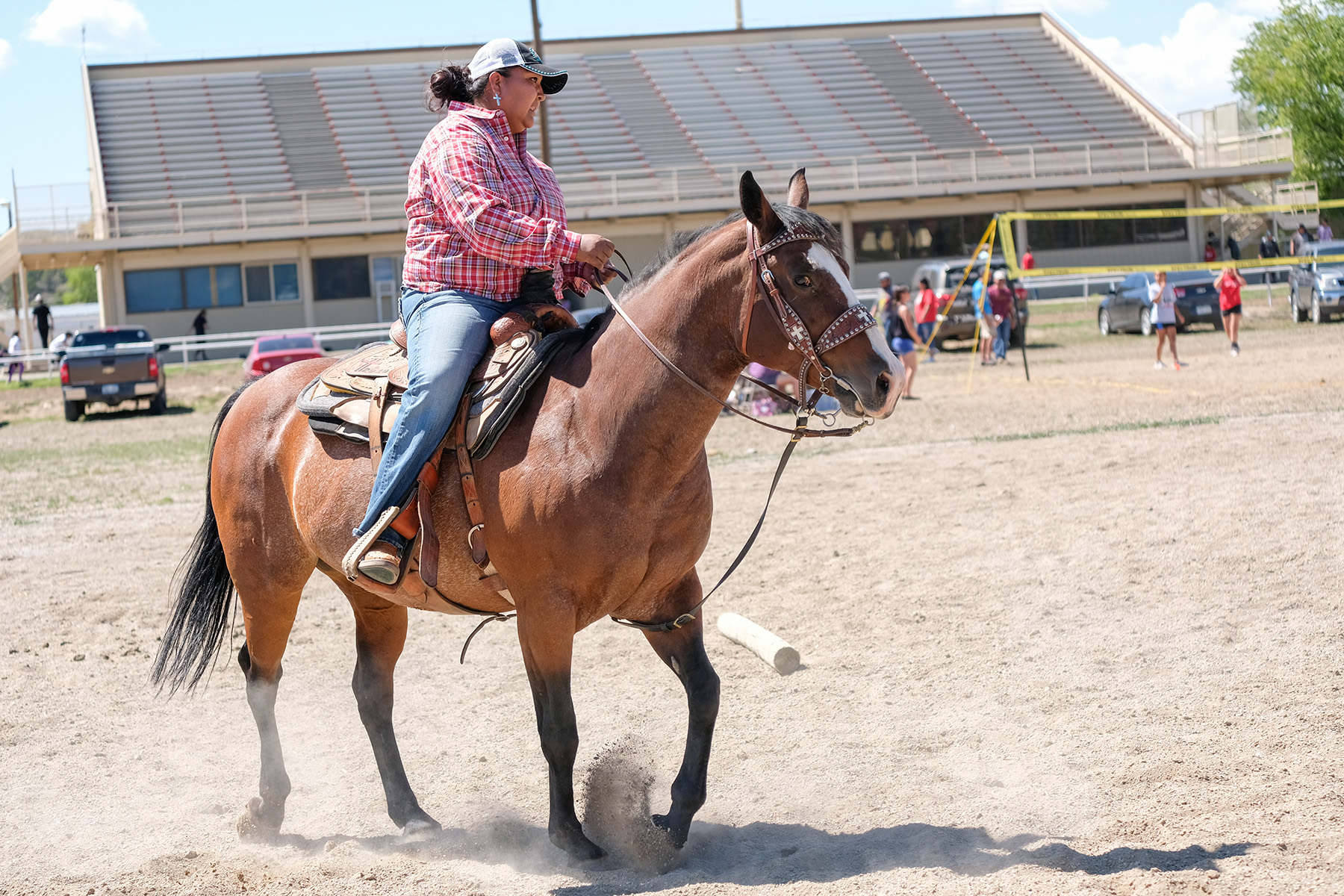 Thunder Windyboy competes in the Sam Burch Memorial Horsemanship Contest with the help of Travis Nanaeto.