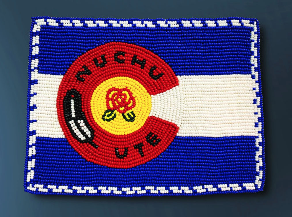 “I’ve been incorporating traditional design, and personal family photos into my beadwork,” Box explained. “I incorporated the Ute culture into this beadwork, the feather in the C symbolized our connection to the Creator; and the flower in the C depicts the Ute. The Utes took the rose from the Spanish, and that was another [example of] symbolism, it was associated with Ute. Originally our beadwork, before the Spaniards, was geometric designs, which I added to the border of the state; I incorporated it into the design.”