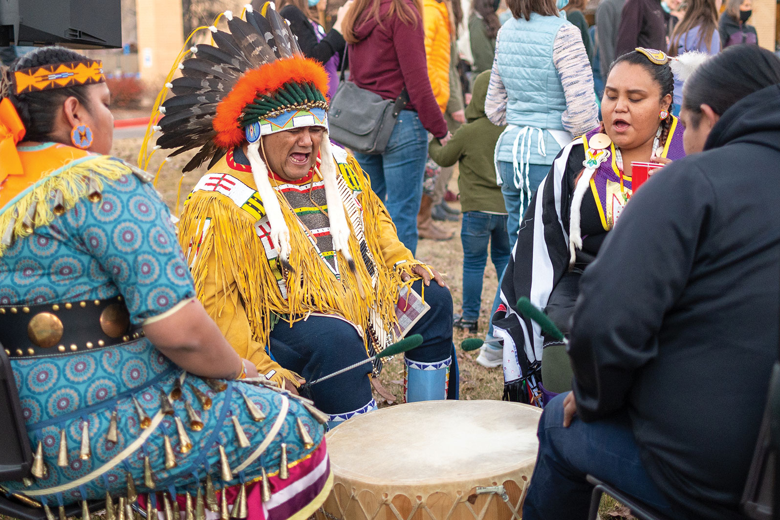 Reggie Lopez sings alongside a drum group from Towac, Colo. during a heritage round dance presentation at the Durango Public Library.