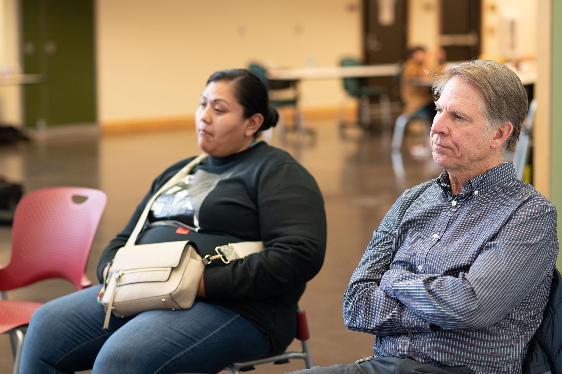 During the noon lunch hour, employees gathered to hear stories told by elders. Paul Whistler attentively listens to a story told by elder Pearl Casias.
