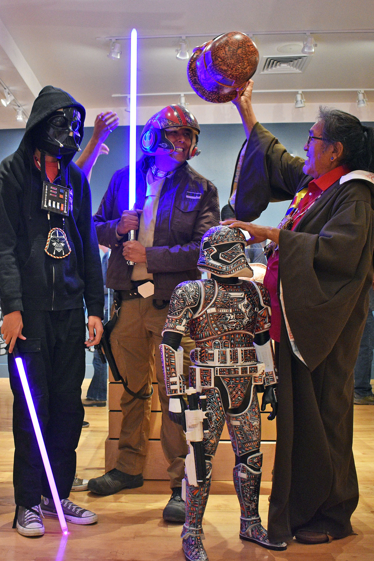 Throughout the exhibit, interpretive blurbs explain how each artist identified with Star Wars themes, including resistance to imperialism, the battle between good and evil, and the similarities between Luke and Leia and the story of the Hero Twins in Navajo and Hopi oral traditions.