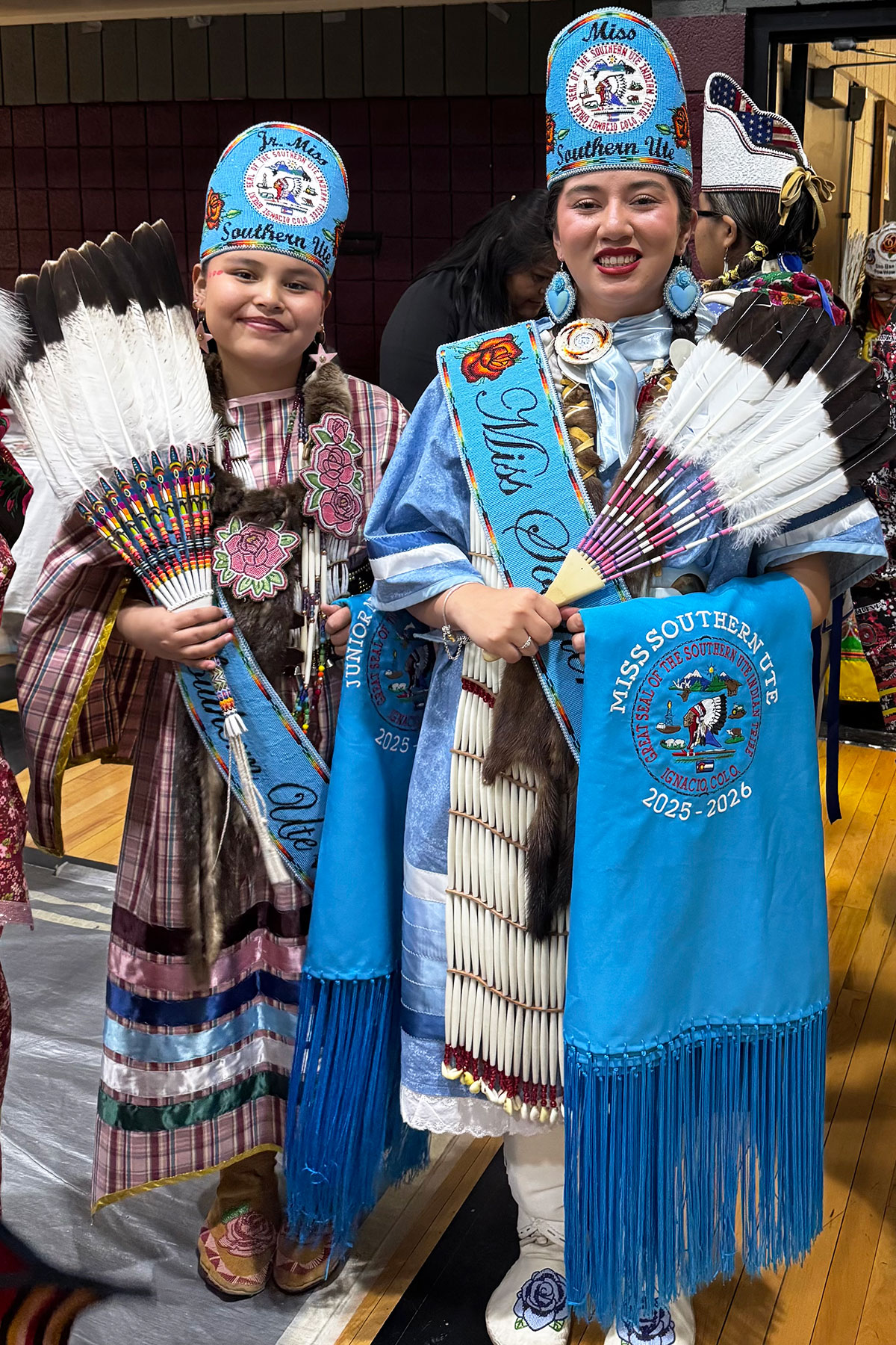 Miss Southern Ute, Zuriah Baker and Junior Miss Southern Ute, Shayne White Thunder during the Grand Entry at the Ute Indian Tribe’s annual Thanksgiving Powwow on Saturday, Nov. 29.