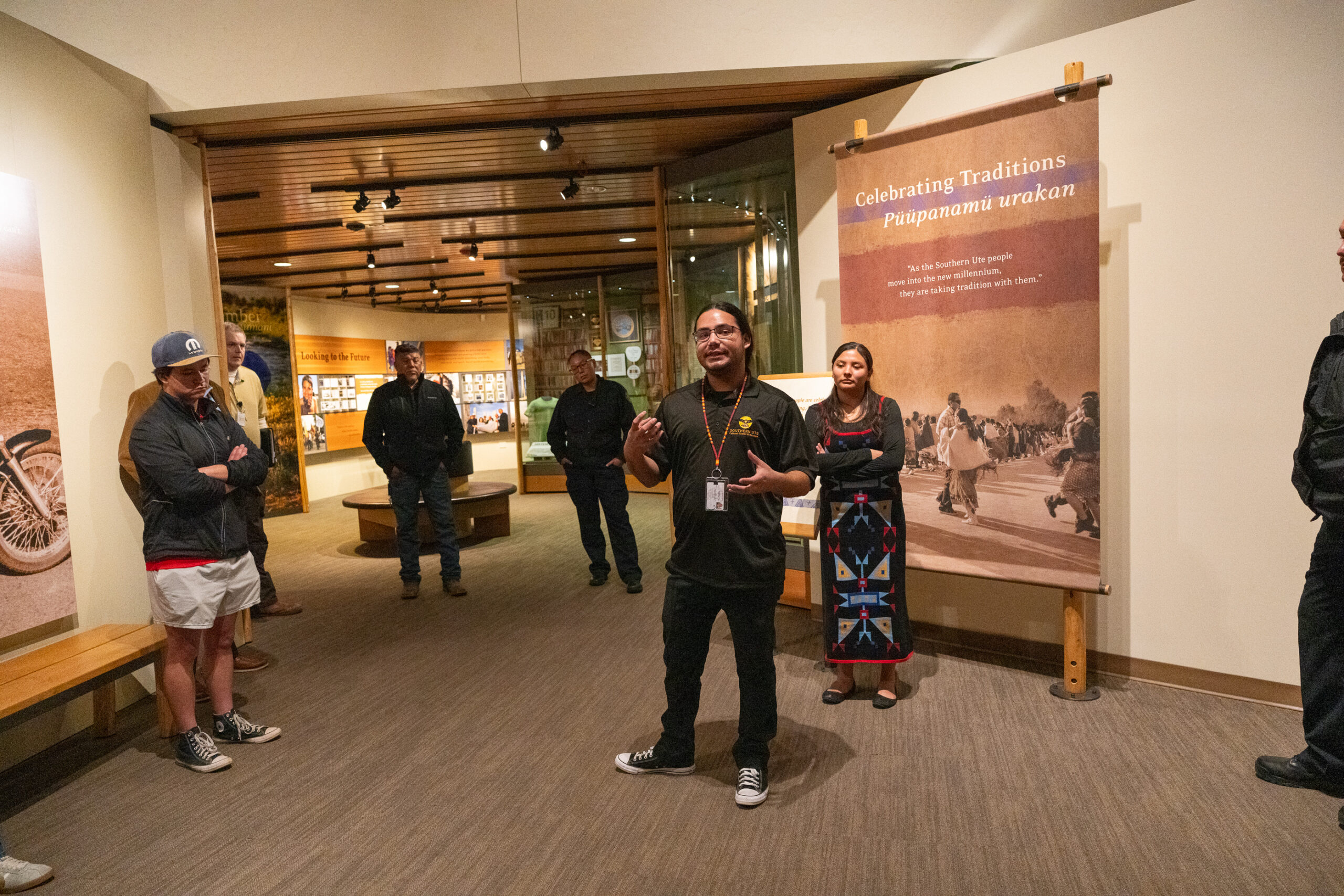 SUCCM Education/Outreach Coordinator, Raelynn Frauenhoff explained the significance of the centerpiece in the main lobby of the museum represents the seven bands of Ute Tribes during the cultural orientation held for all new Southern Ute tribal employees, Wednesday, Jan 7.