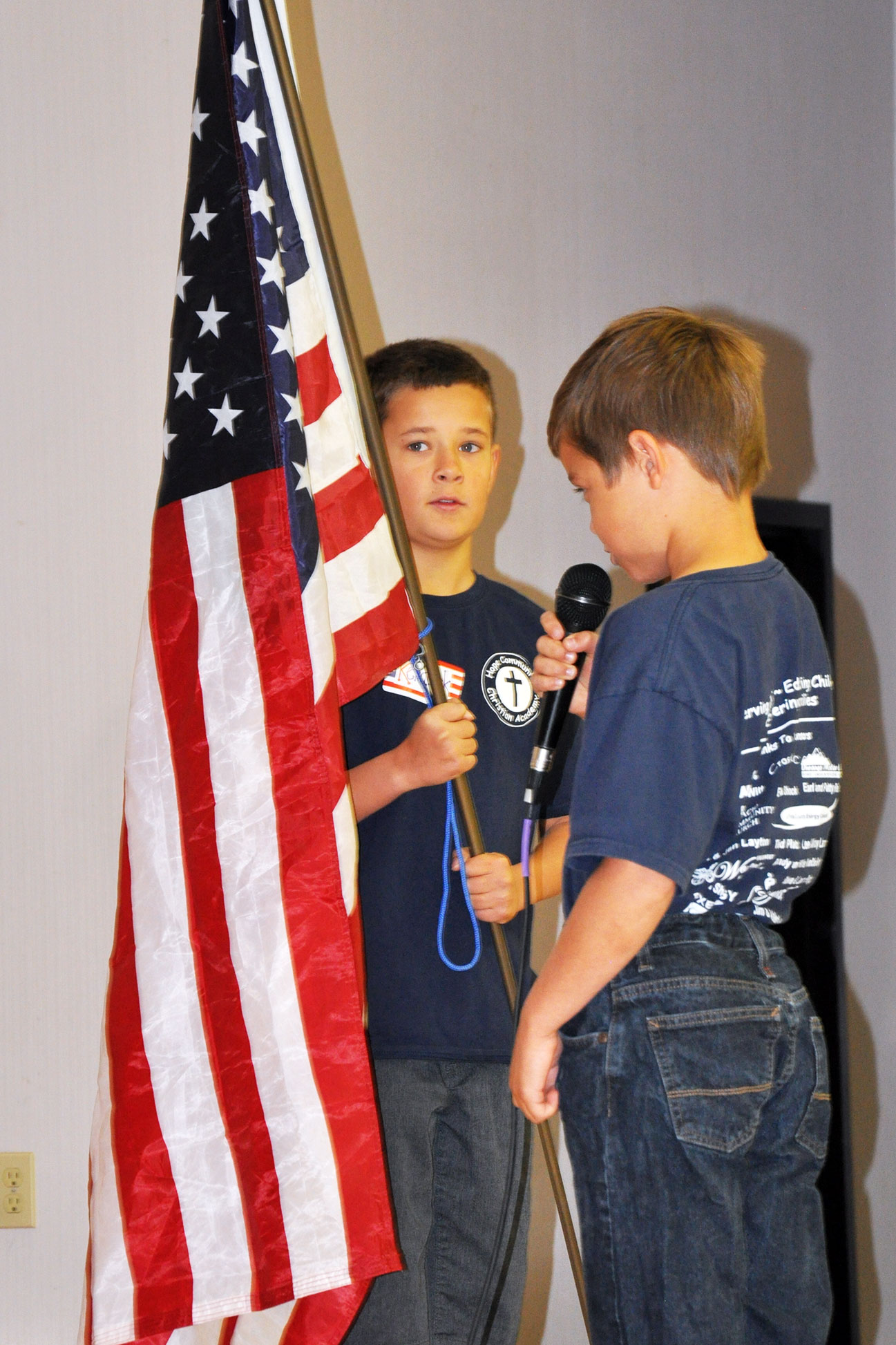 Kendrick Nossman and Brayden McEwen lead the Pledge of Allegiance to begin the Hope Community Christian Academy Veteran’s Breakfast at ELHI on Saturday, Nov. 12.