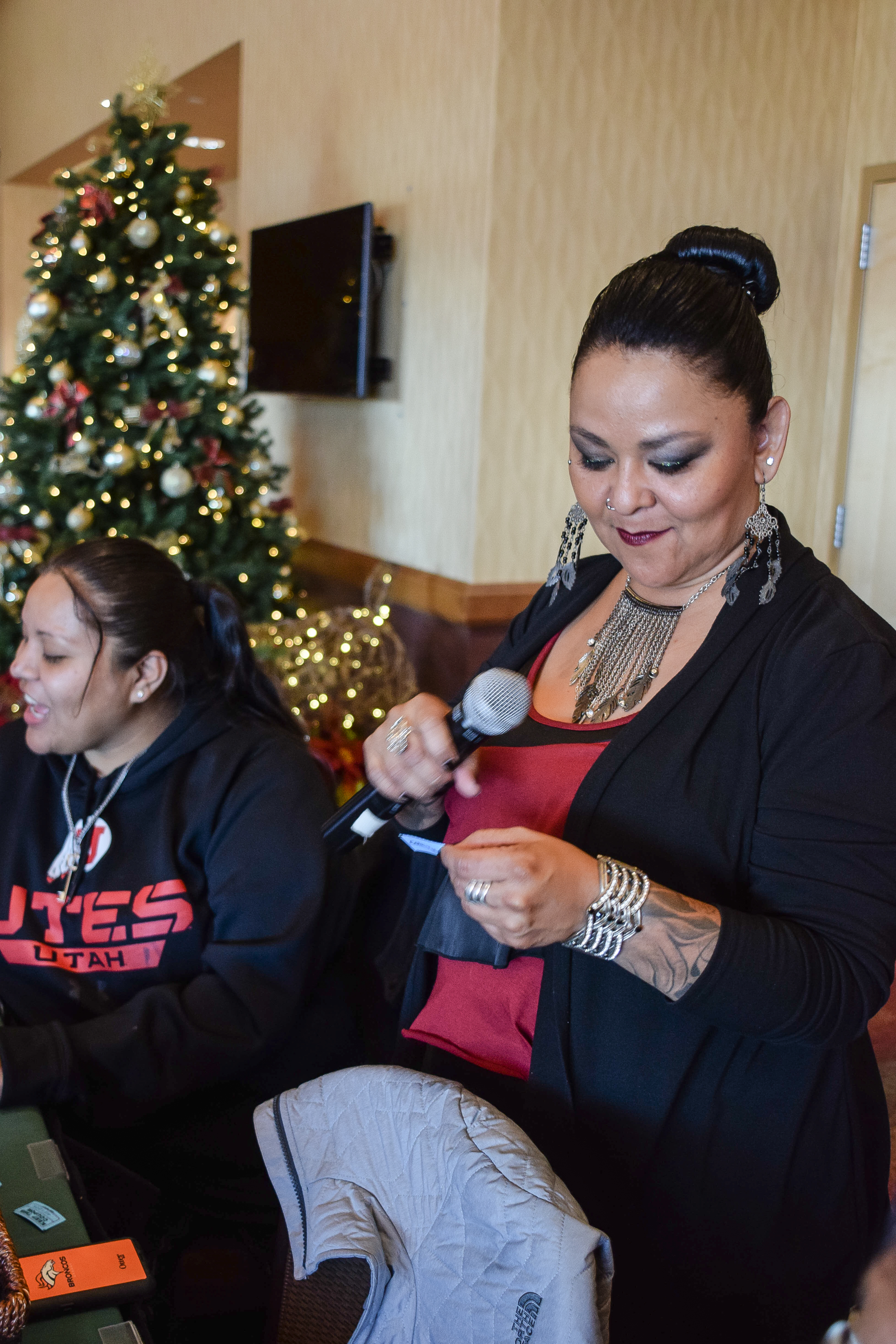 Tara Vigil, Special Events Coordinator, reads off raffle numbers during the annual Tribal Christmas Dinner hosted at Sky Ute Casino on Saturday, Dec. 17.