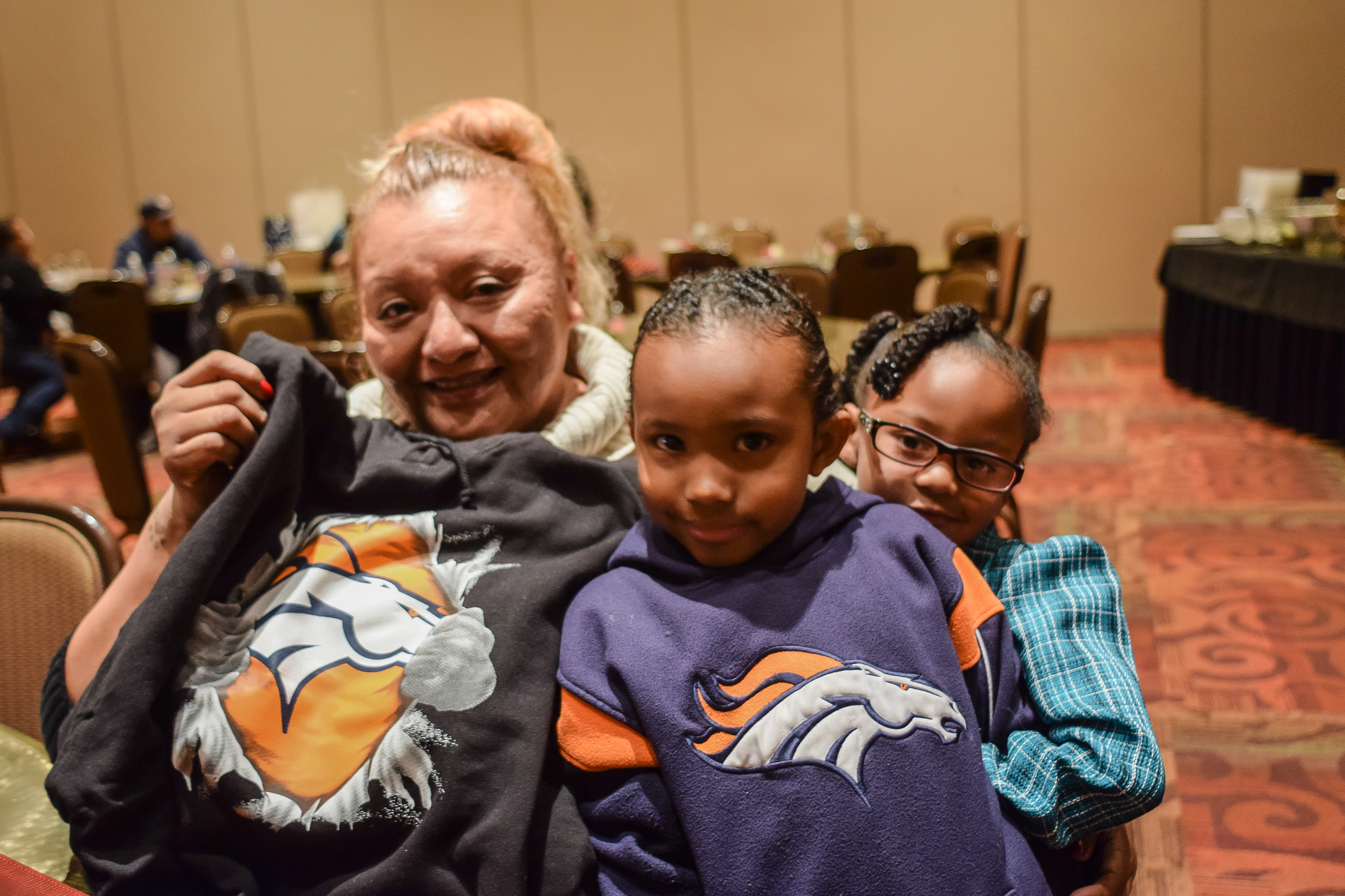 Joyce Delaware Ford celebrates her birthday at the Christmas dinner with her grandkids Na’Sir Butcher and Babie Maloid.