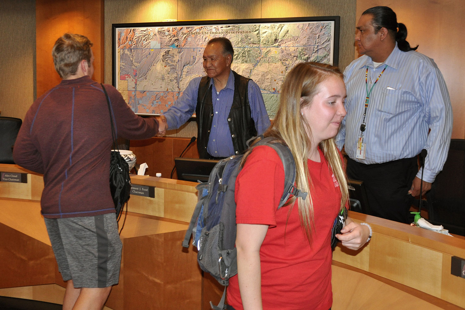 Golden High School students shake council members hands and receive pins of the Southern Ute Tribal Seal.