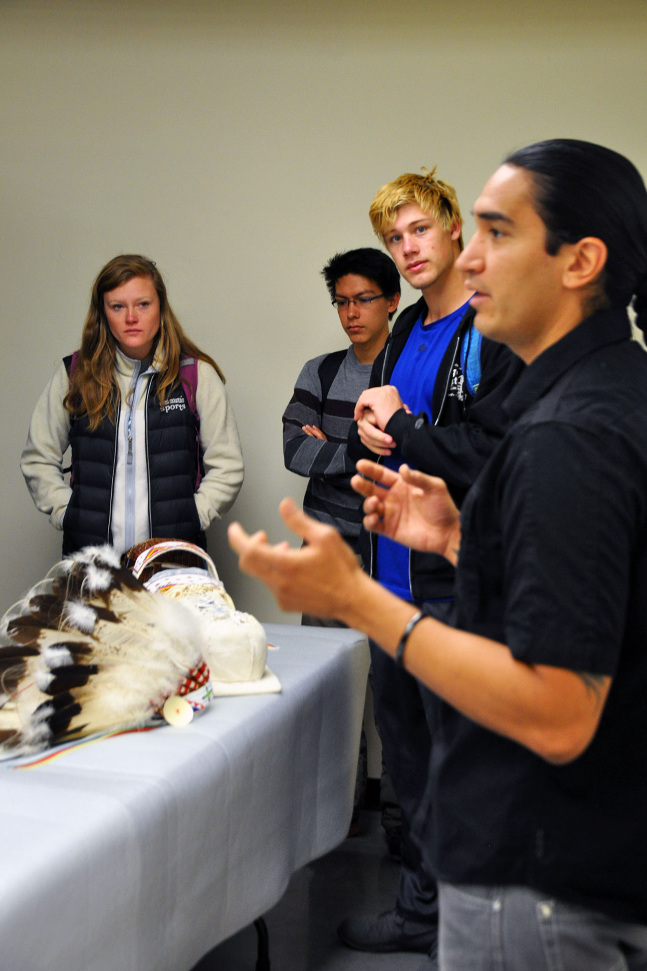Dan Rhode, Museum contractor explains how the museum stores, handles and displays items used in exhibits at the museum. He also explained the varying aspects of the cradleboard and headdress to the Golden High School students.