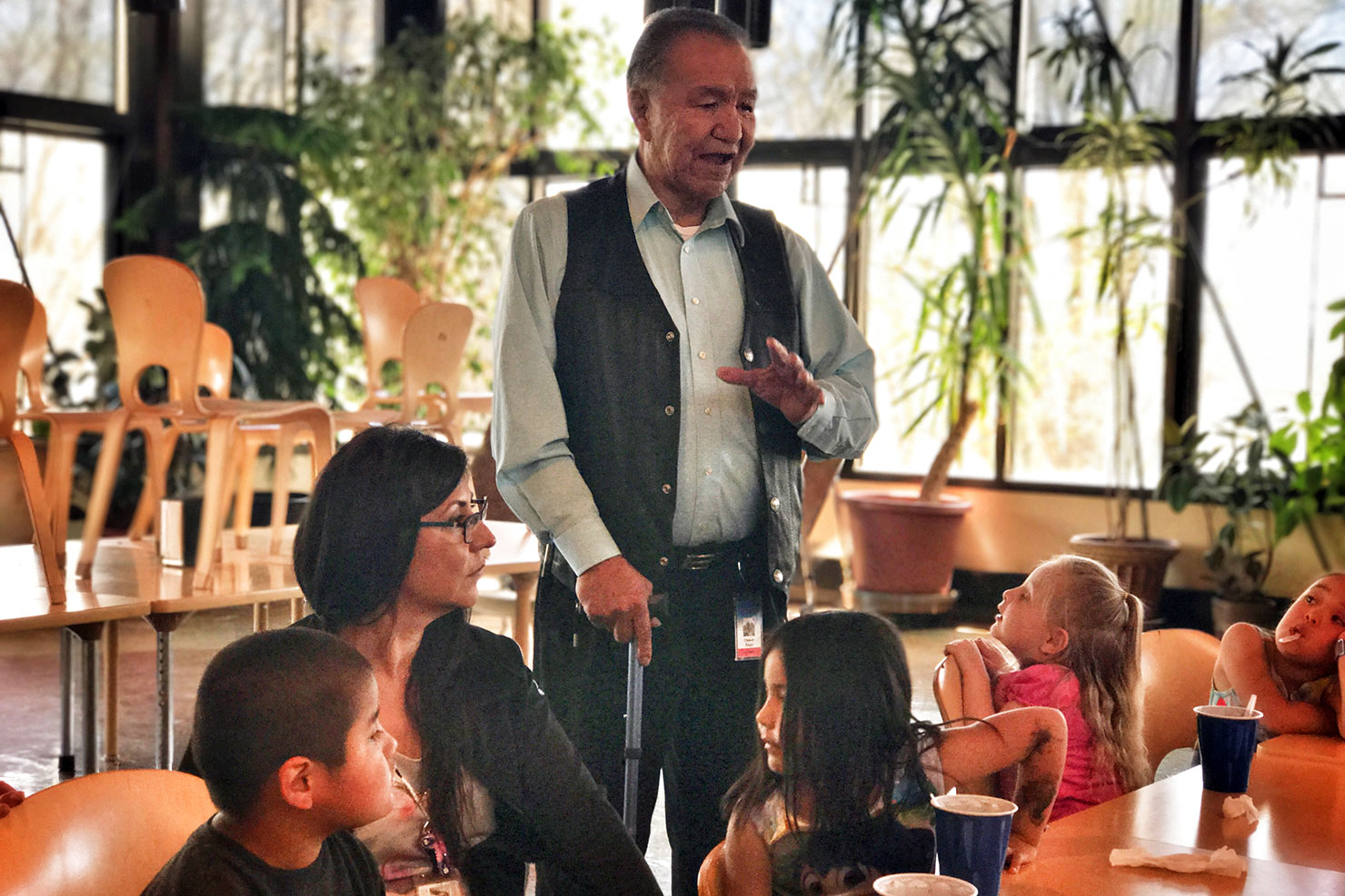 Chairman Frost congratulates the winners of the Southern Ute Indian Montessori Academy box-top classroom contest. Tribal Council served Root Beer Floats to the Upper Elementary students on Friday, April 14.