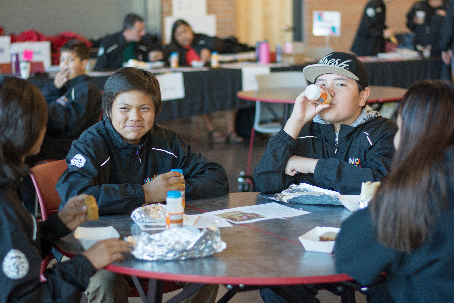 Nate Hendren and Damarion Goodtracks sit with friends while eating before the conference begins.