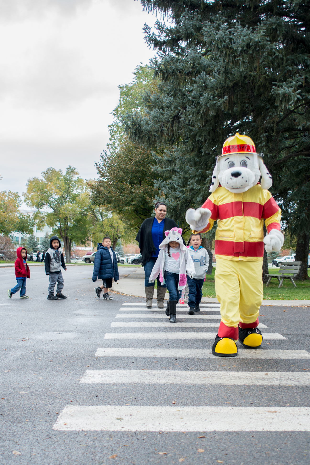 Sparky the Fire Dog, leads primary one Juana Hendren and Monique Marquez’s Classroom across the street to have students return to school after exploring the Los Pinos Fire Department’s truck on Wednesday, Oct. 17