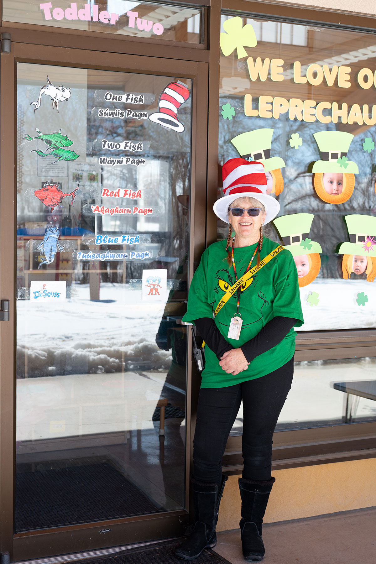 Southern Ute Indian Montessori Academy celebrates National Read Across America Day and Dr. Seuss’s birthday, otherwise known as Dr. Seuss Day, Thursday, March 2. Principal Mari Jo Owens celebrates in a Dr. Seuss themed outfit, next to the Toddler Two Seuss themed door.