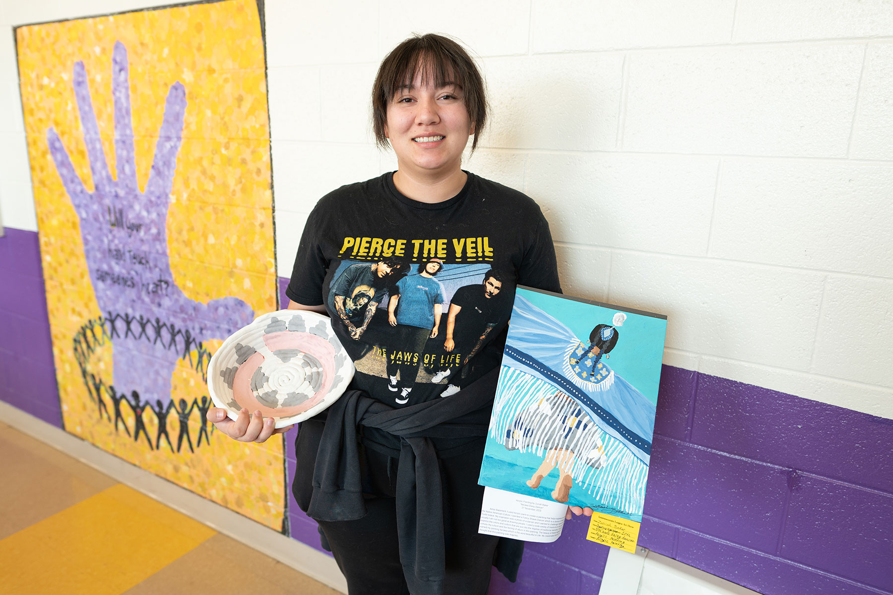 Southern Ute tribal member Zuriah Baker holds her pottery and painting she submitted for the Native American Heritage Month art display on Thursday, Nov. 30 inside Bayfield High School. The school gave recognition to the Native American artists who shared their heritage with their individual art pieces.