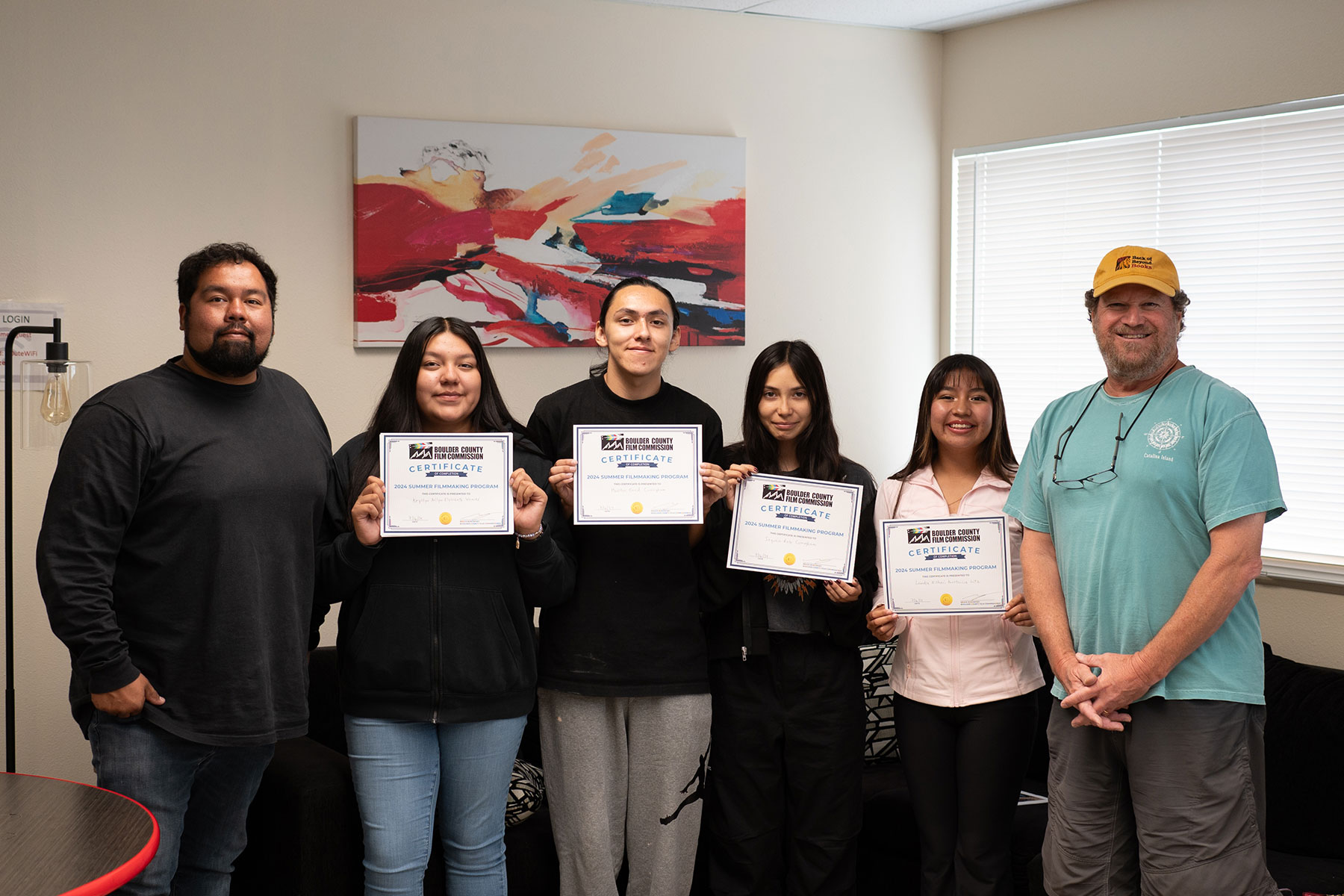 The Southern Ute Education Department hosted a two-week film workshop for tribal students, Monday, July 8 through Tuesday, July 16. Krystyn Weaver, Houston Cunningham, Sequoia Cunningham, and Leandra Litz learn film making skills from professional film makers Bruce Borowsky and Joey Lopez. Students worked to create a short documentary based on this year’s Tri-Ute Games, filming all sporting events and interviewing participants. On Tuesday, July 16, each student was given a certificate recognizing their hard work and dedication to creating their film; the film’s premier date will be announced later.