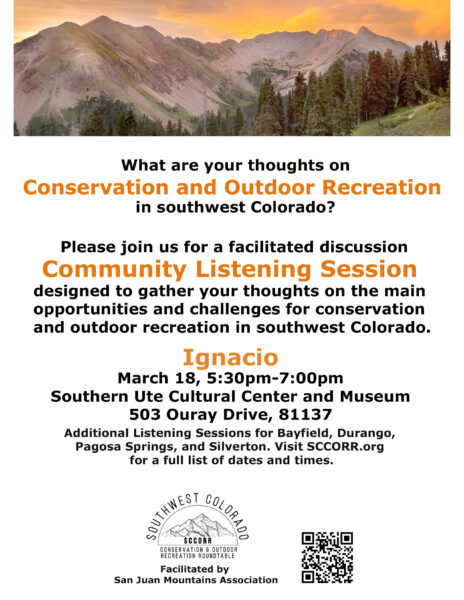 The Southwest Colorado Conservation and Outdoor Recreation Roundtable (SCCORR) is a new Colorado Outdoor Regional Partnerships Initiative for Archuleta, La Plata, San Juan, and southern Hinsdale counties. SCCORR is funded through Colorado Parks and Wildlife (CPW), stemming from the Governor’s 2020 executive order to develop a “locally rooted approach to ensure we remain a world-class outdoor destination while preserving our land, water, wildlife, and quality of life.” This new coalition will use awarded funding to convene diverse users and voices from the region to identify common ground, share up-to-date information, and chart a course for the region to identify overarching goals and strategies related to conservation and outdoor recreation.