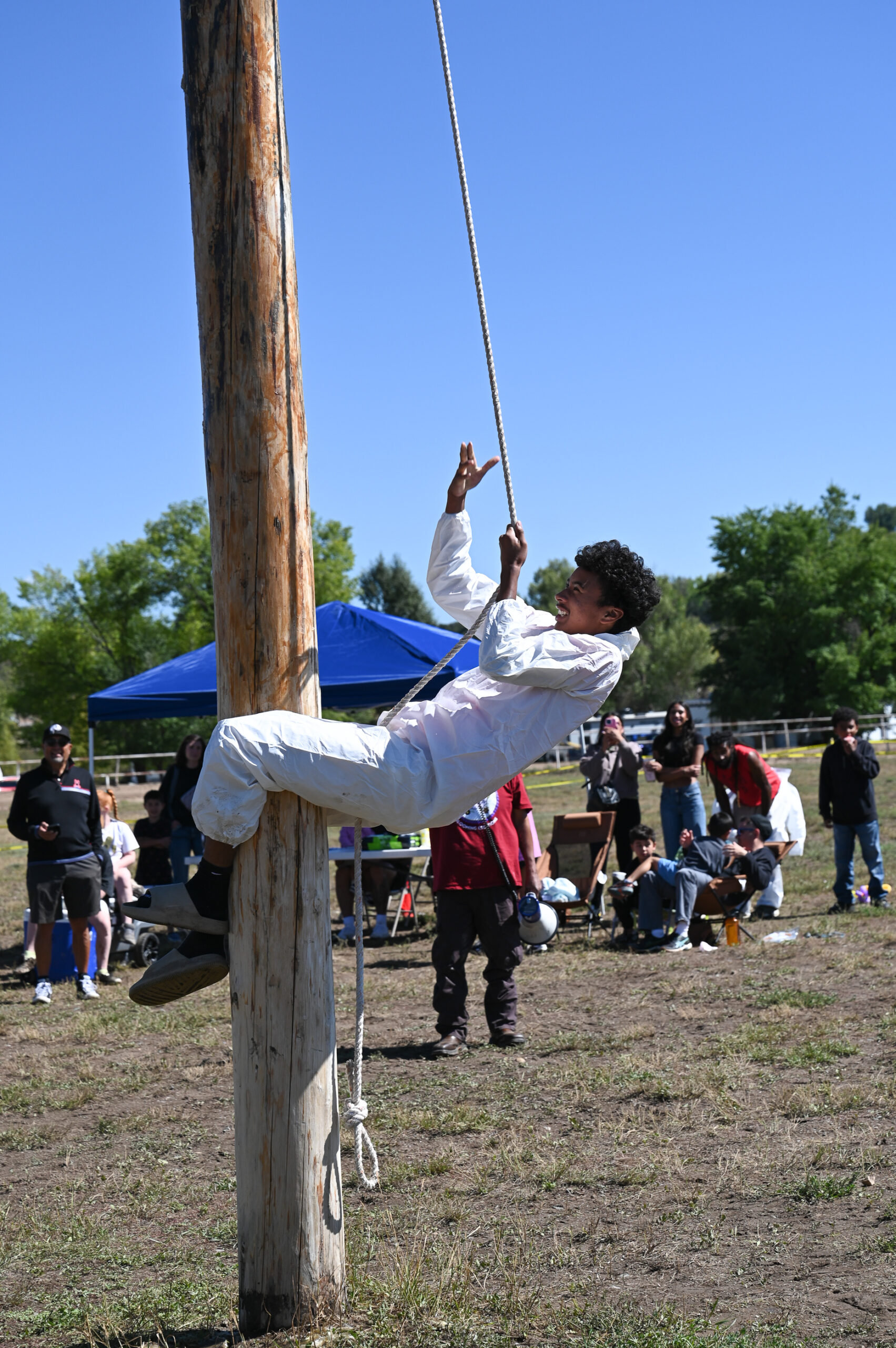 Southern Ute tribal member Amethyst Violet Weaver waves to her family before she tests her might on the grease pole challenge!
