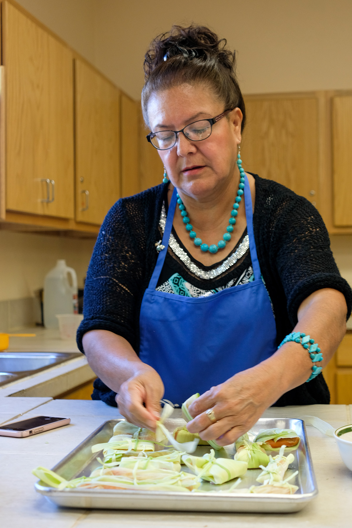 Southern Ute tribal member, Jennifer Goodtracks, wraps applewood smoked trout in cornhusks as she and others complete the lunch they prepared a part of Shining Mountain Health and Wellness’s two-day foraging and culinary class. In collaboration with the ‘Partnership with Native American’ program.