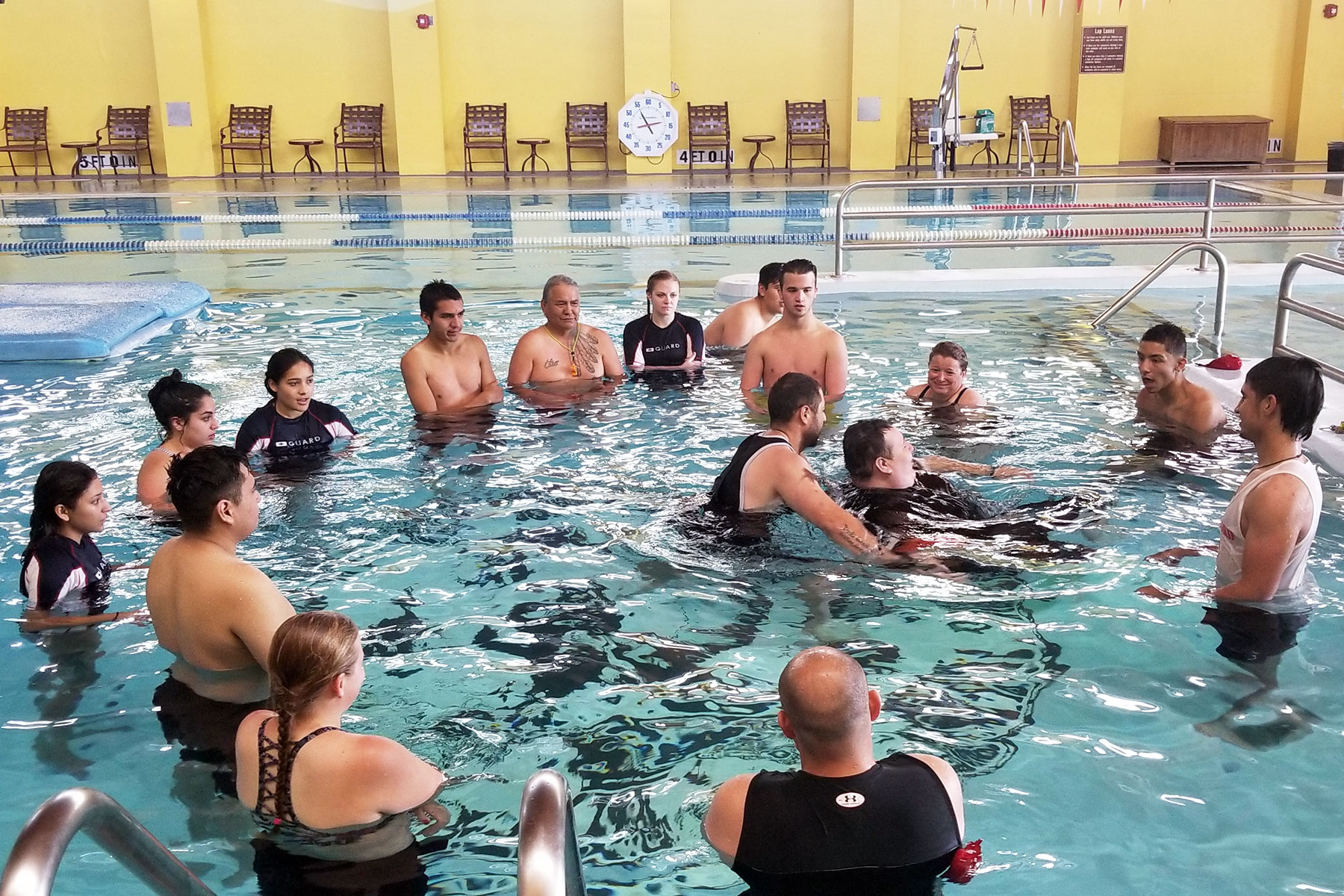 Tim Velasquez, Andrew Morgan and Leela Rosa sharpen their skills at the annual recertification in-service for lifeguards.