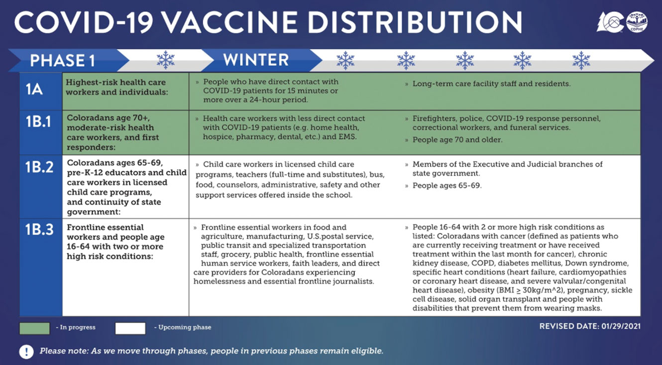 Governor Polis also announced that the State estimates that close to March 5, frontline workers and Coloradans ages 16-64 with two or more high-risk conditions will also be eligible to receive the vaccine. It’s also projected that Coloradans ages 60 and up will also be able to start receiving the vaccine around March 5.