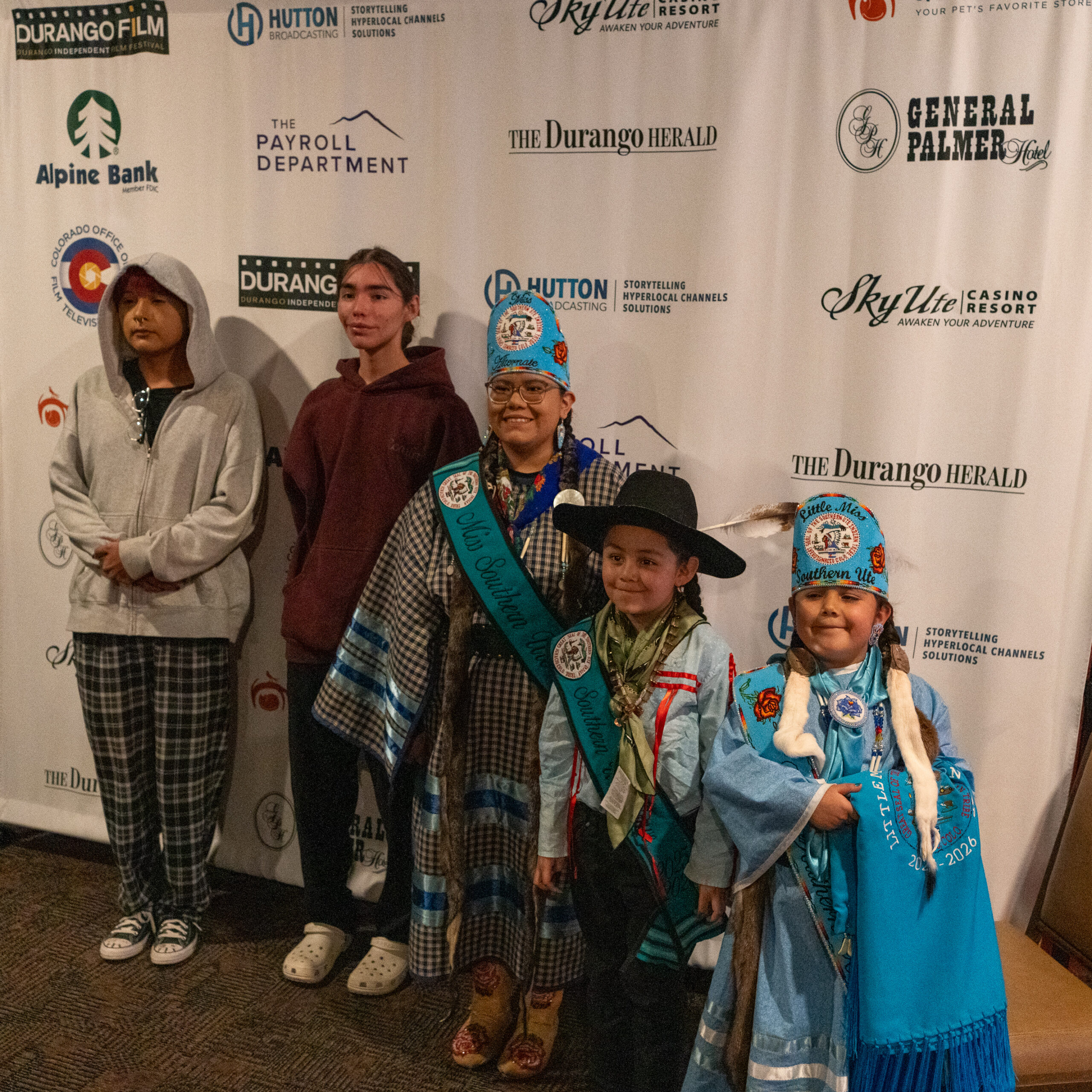 Miss Southern Ute Alternate, Autumn Sage; Southern Ute Brave, Theoden Greany and Little Miss Southern Ute Starlitt Greany stand with Faustino Joy and John Oberly, two of the featured Ute film makers.