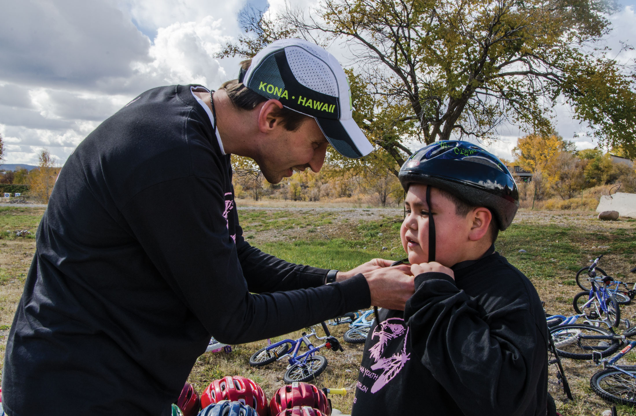 Nathaniel Howe of the Southern Ute Indian Montessori Academy gets help in preparing his helmet for the triathlon bike ride.