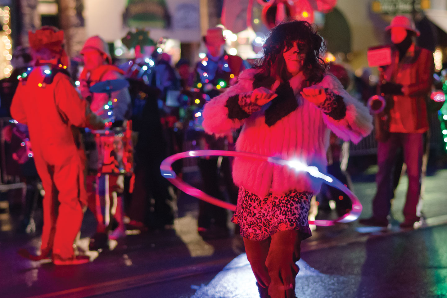 The frigid air didn’t stop a crowd from appearing. Various floats provided heat by blasting flames high in the air, warming everyone nearby.