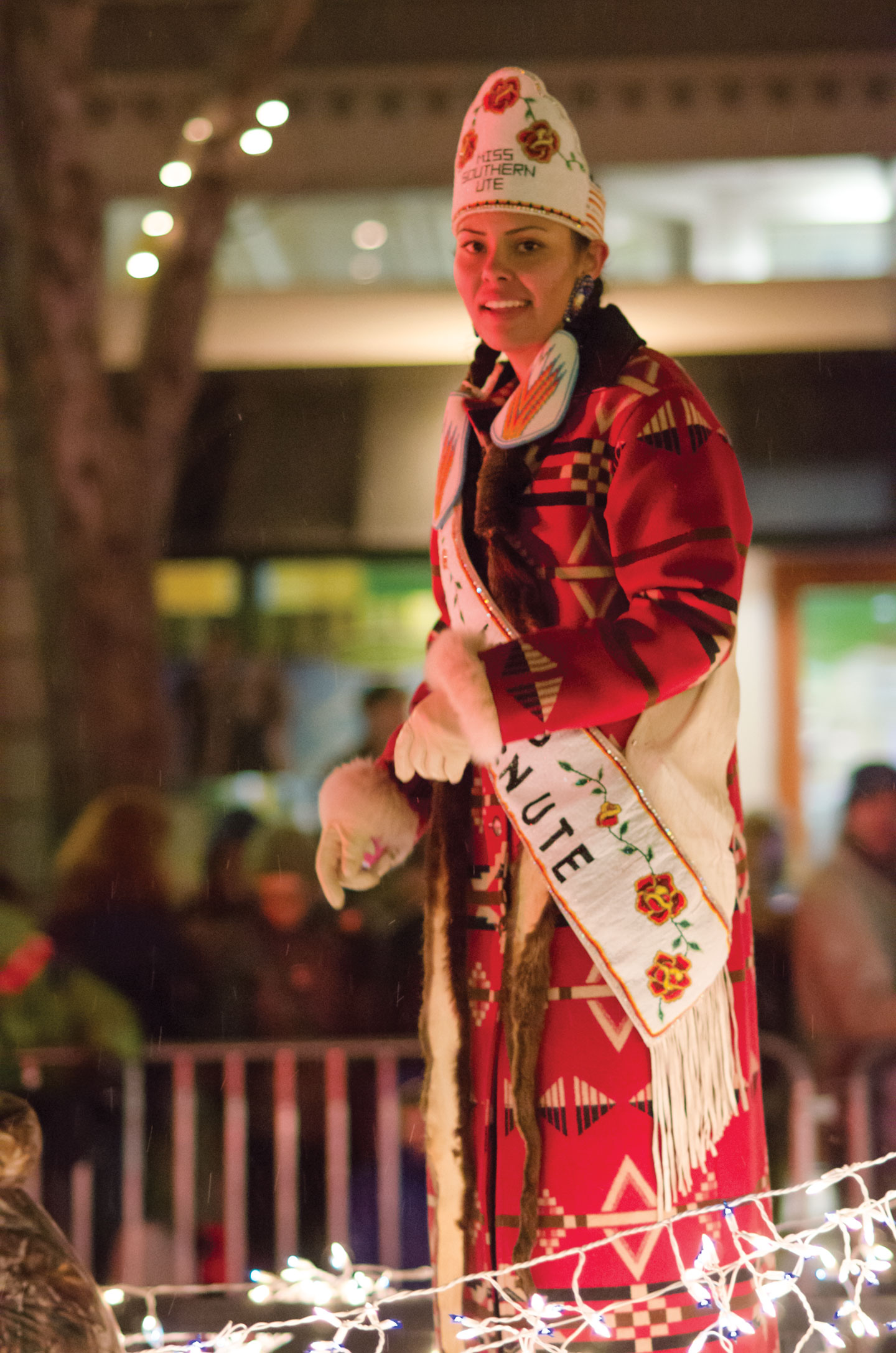 Amber Doughty and Tauri Raines of Southern Ute Royalty supported the tribe in this year’s parade. Doughty flashes a smile before throwing a handful of treats.