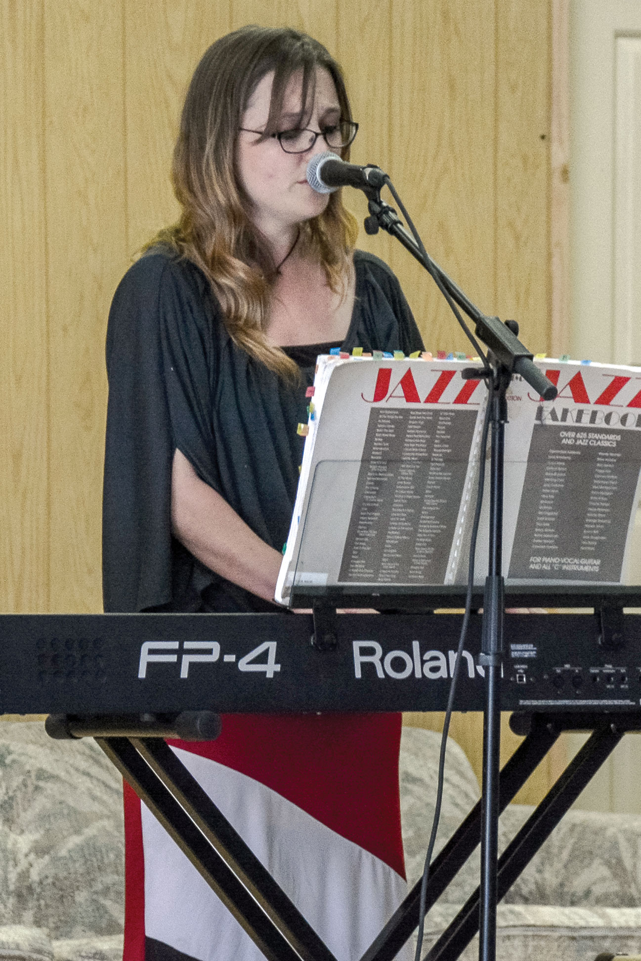 Katrina Hedrick, Ignacio Middle/High School band and choir teacher, sings a ballad by Billie Holiday while playing the piano, as a part of the high school talent show held on Thursday, March 26 at Ignacio High School.