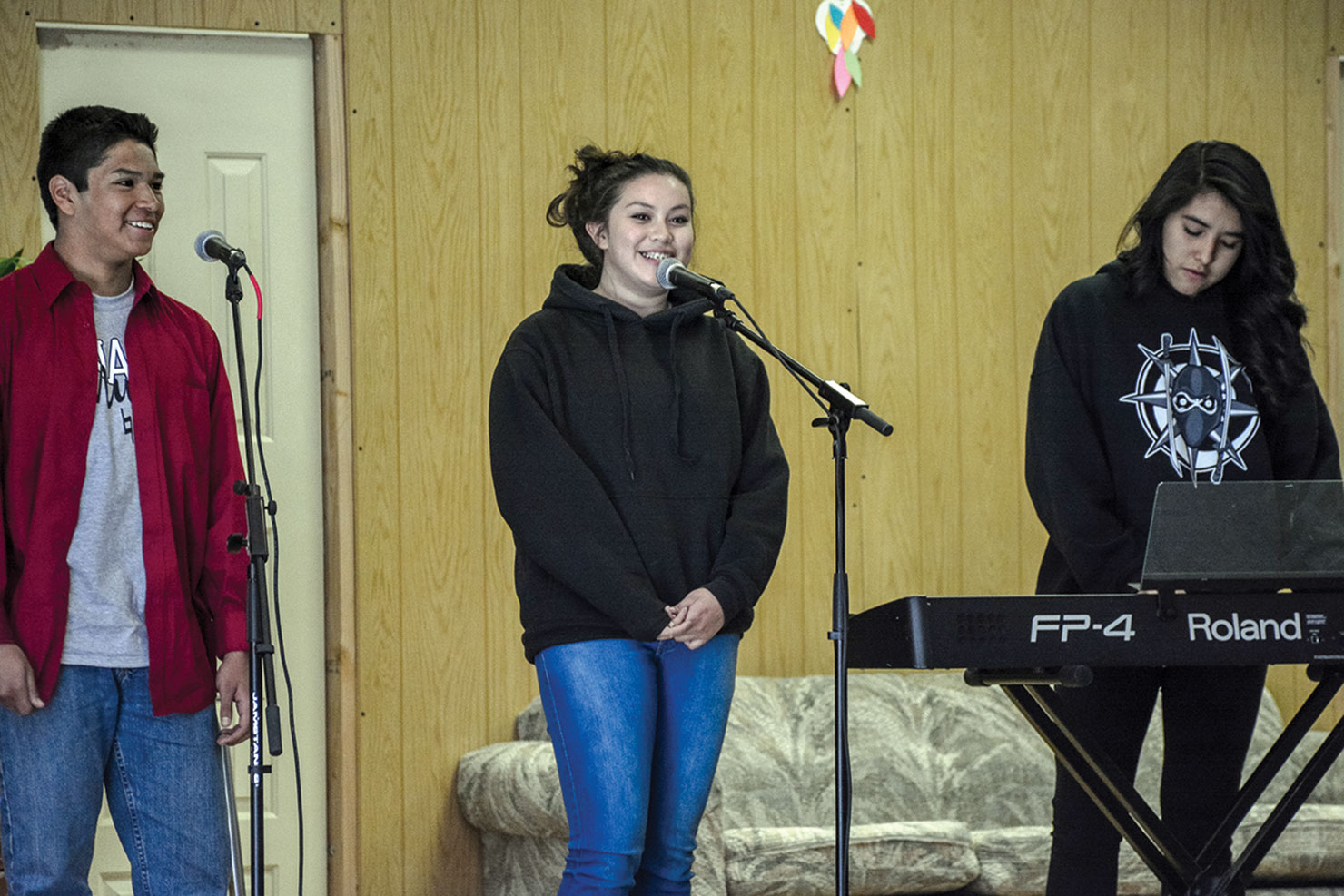 Justis Herrera and Aislinn Ryder sing a song while Mamakwa Valdez plays the keyboard at the high school talent show.