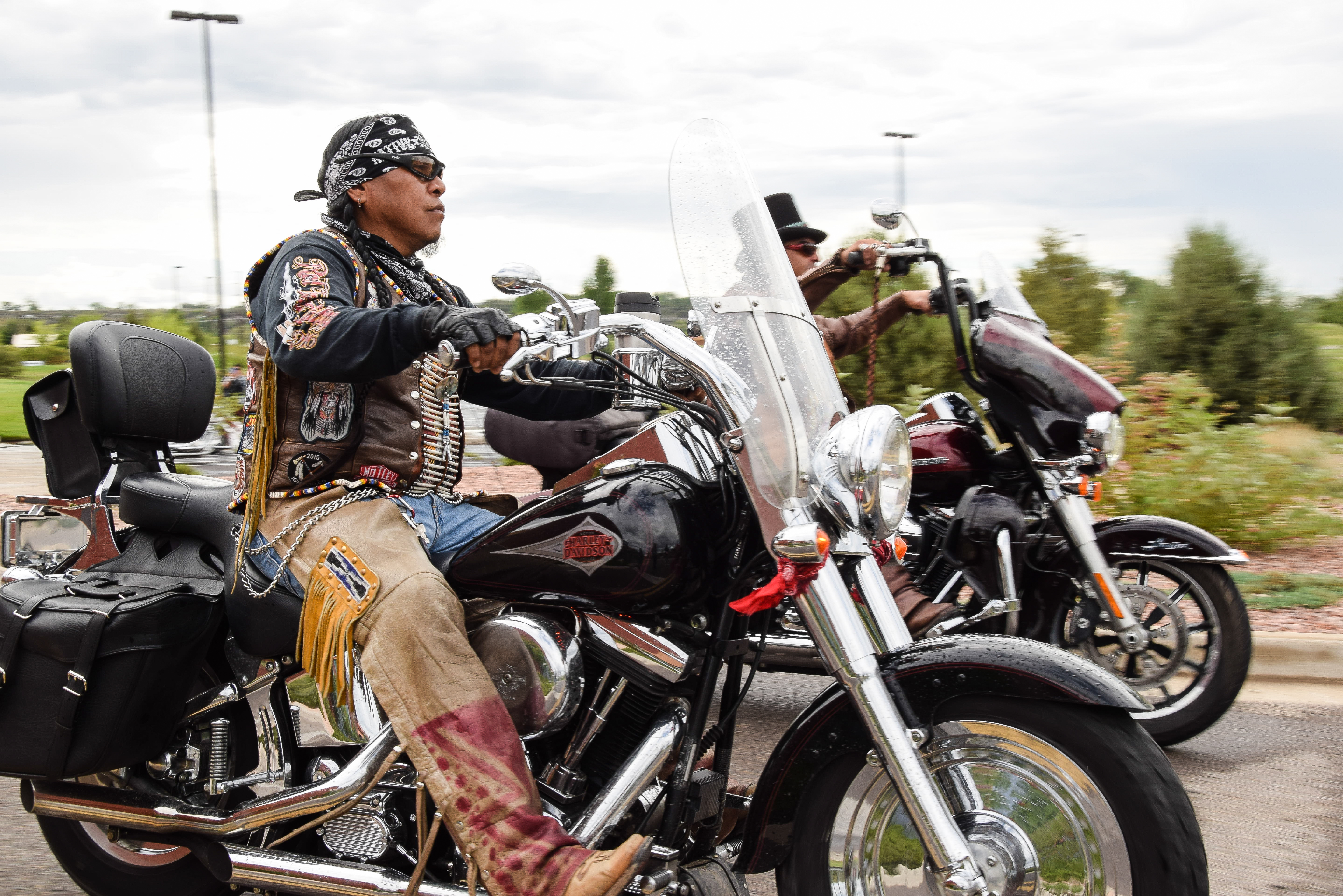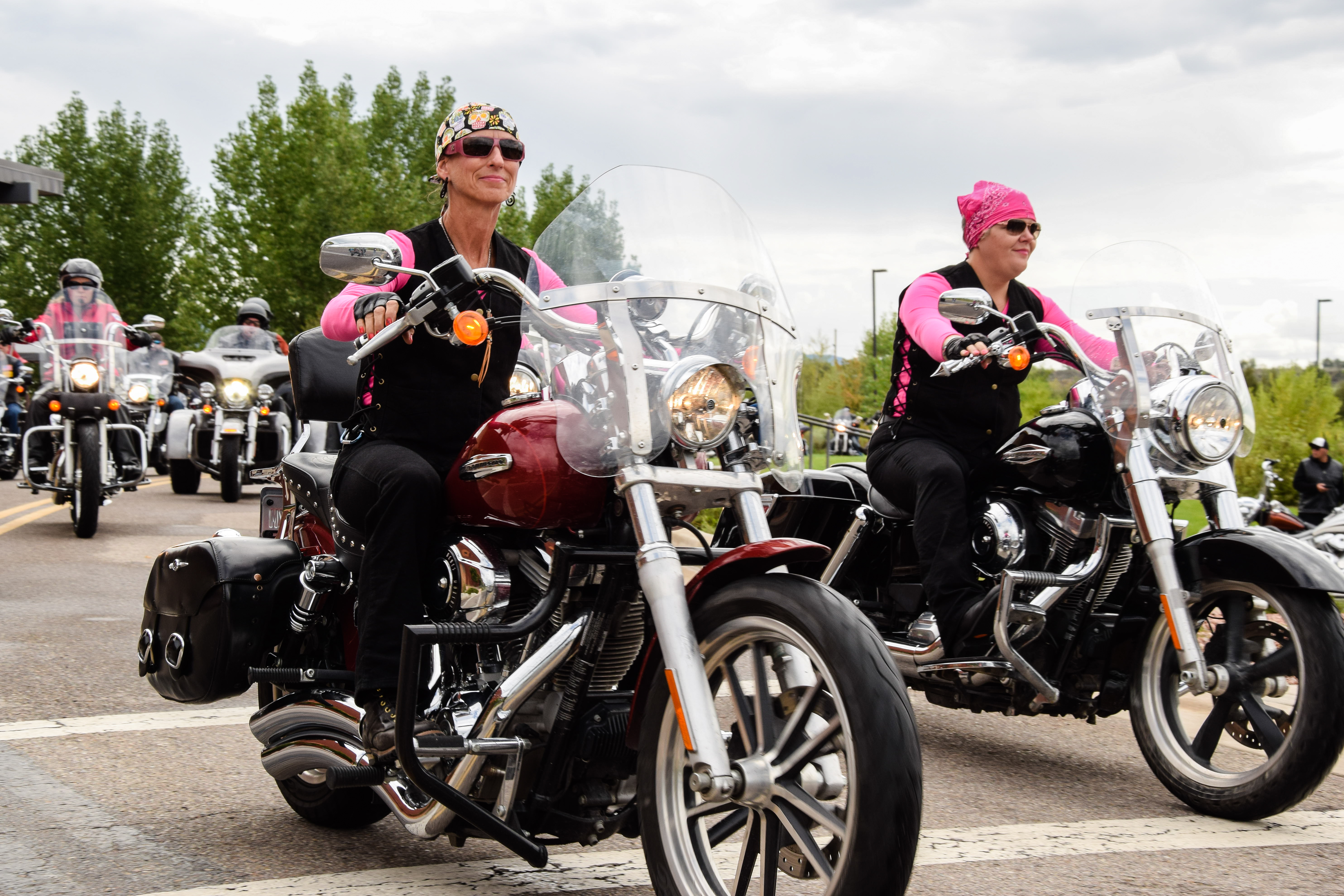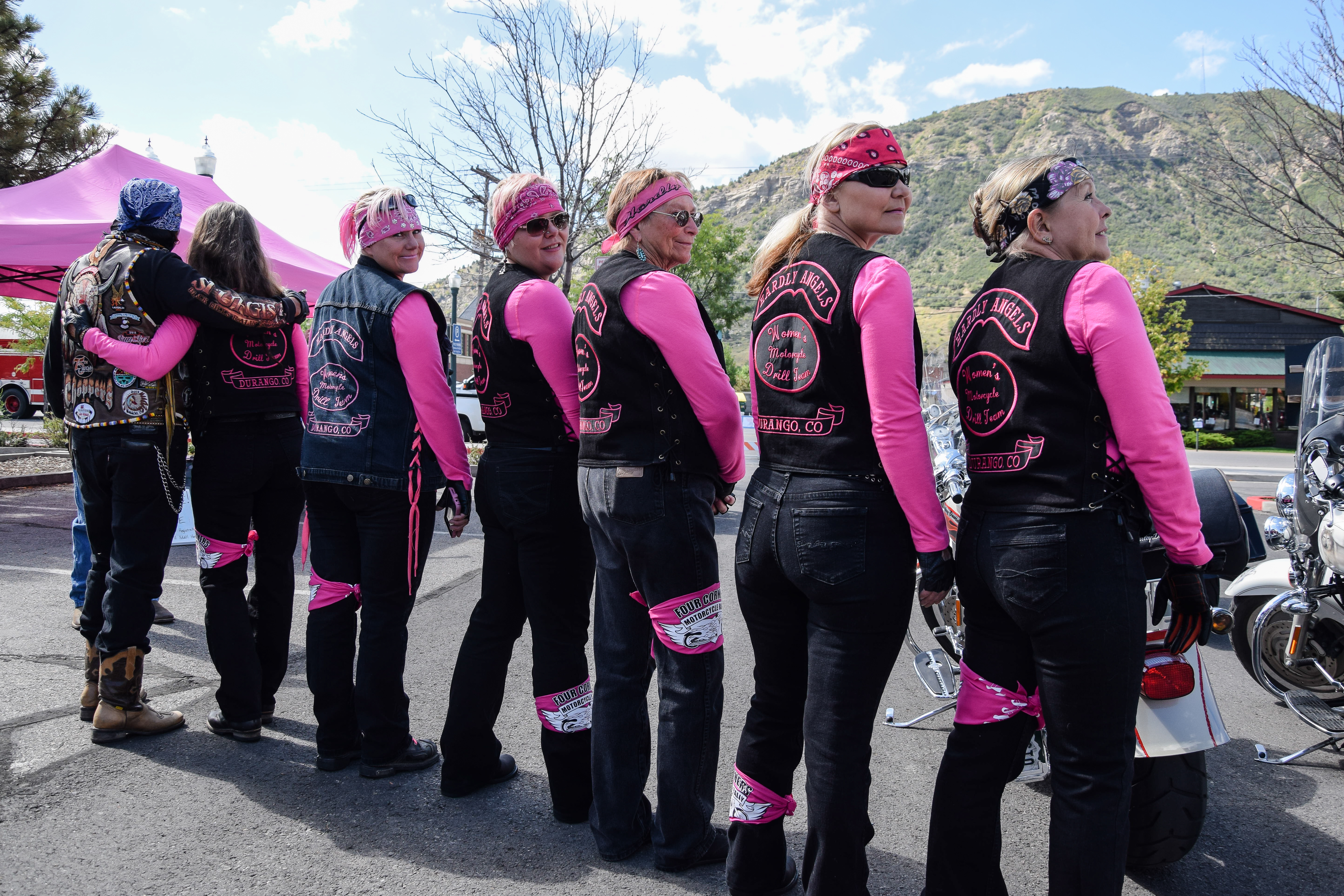 Members from the Hardly Angels biker group cruise to the Sky Ute Fairgrounds.