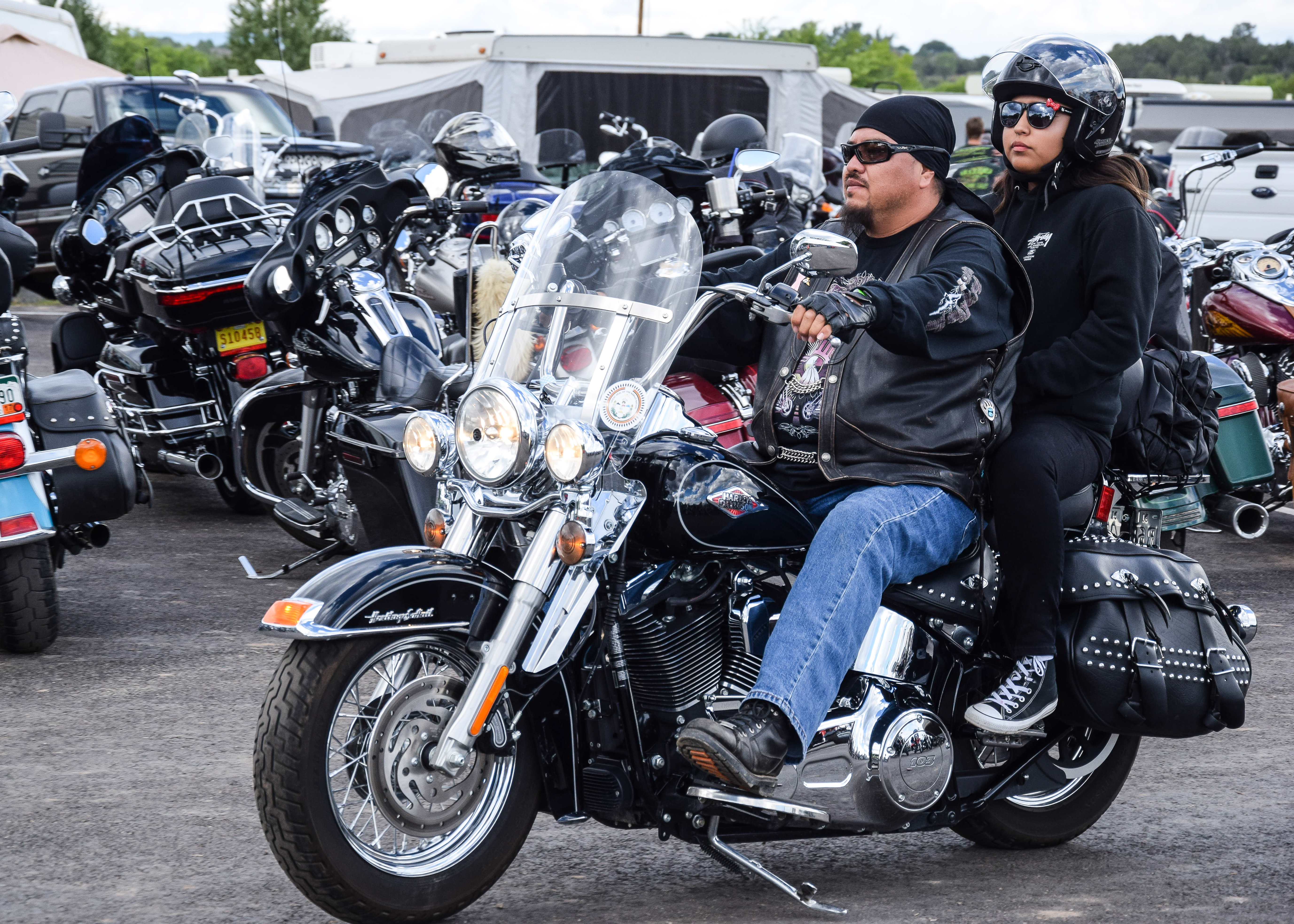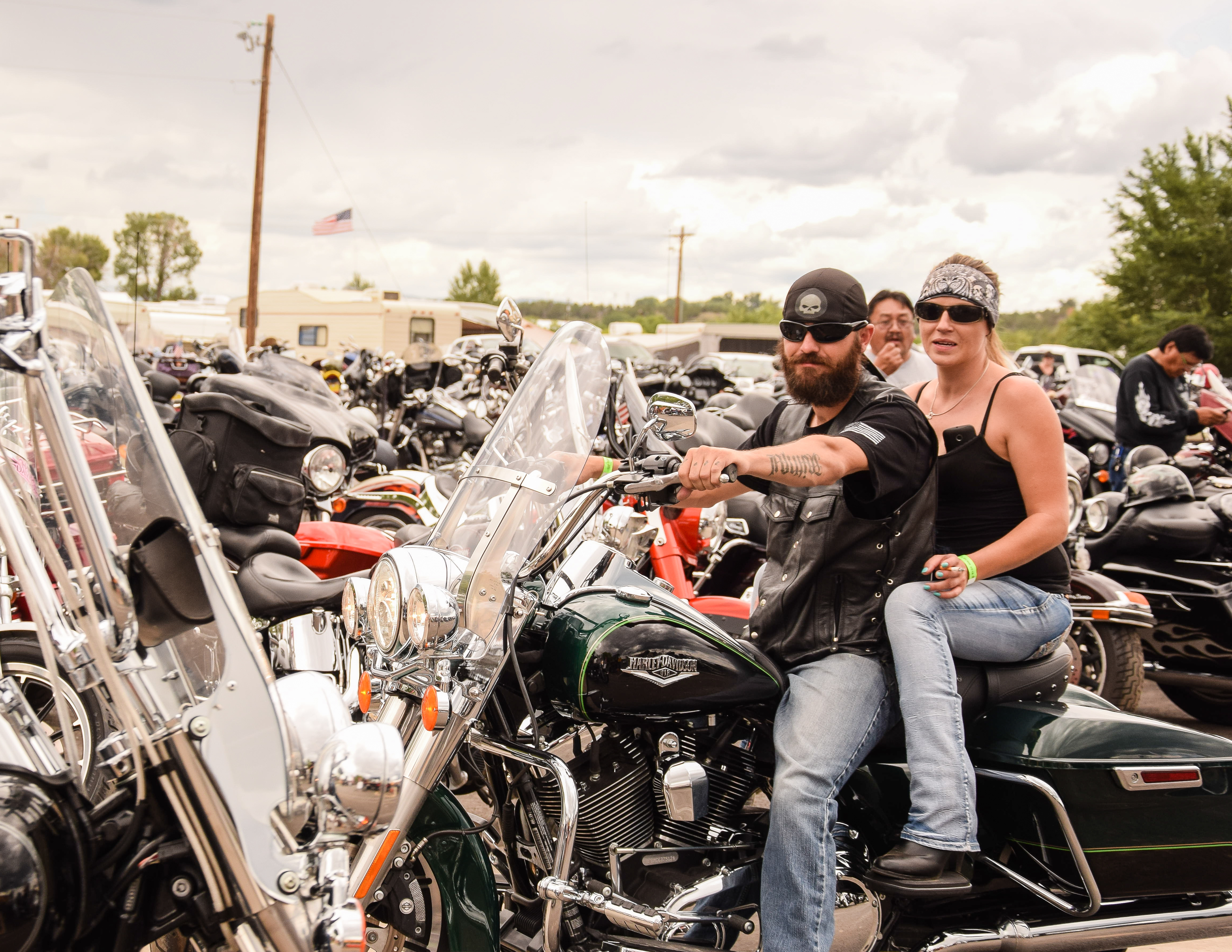 Kylee Thompson rides to the Sky Ute Fairgrounds alongside Sam Maez during the second day of the Four Corners Motorcycle Rally.