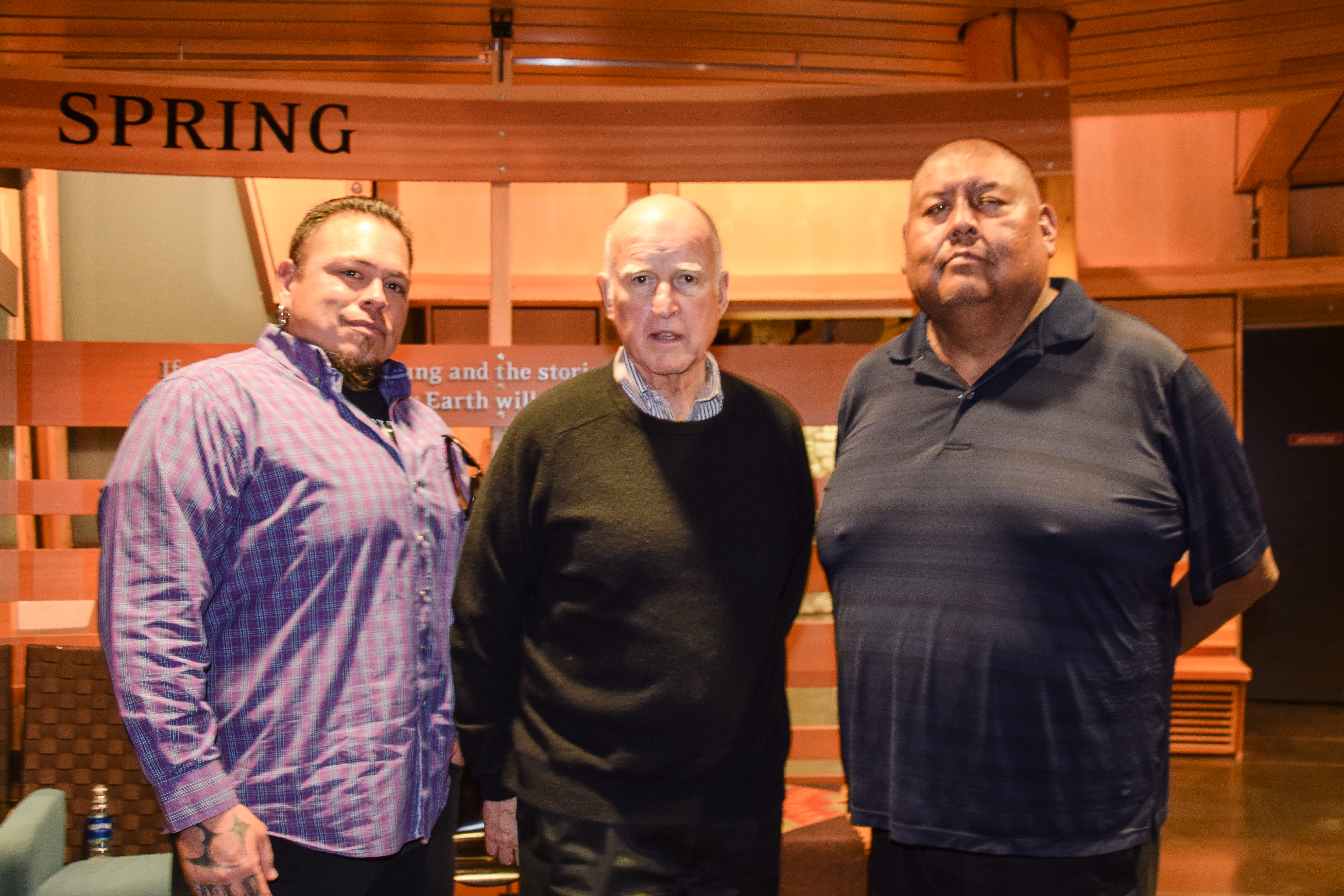 Tribal Councilmembers Tyson Thompson and Alex S. Cloud pose for a photo with California Governor Jerry Brown.