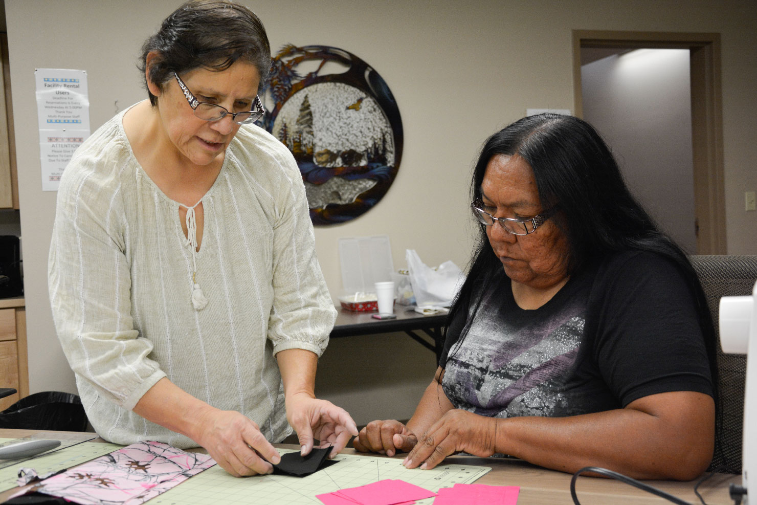 Elders join Elise Redd for Bear Paw Quilt Workshop at the Multi-Purpose Facility.