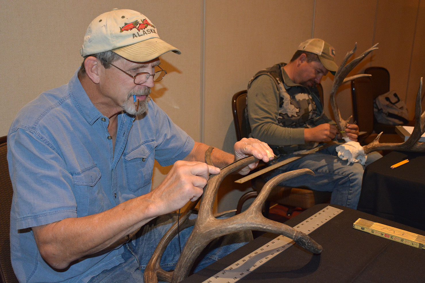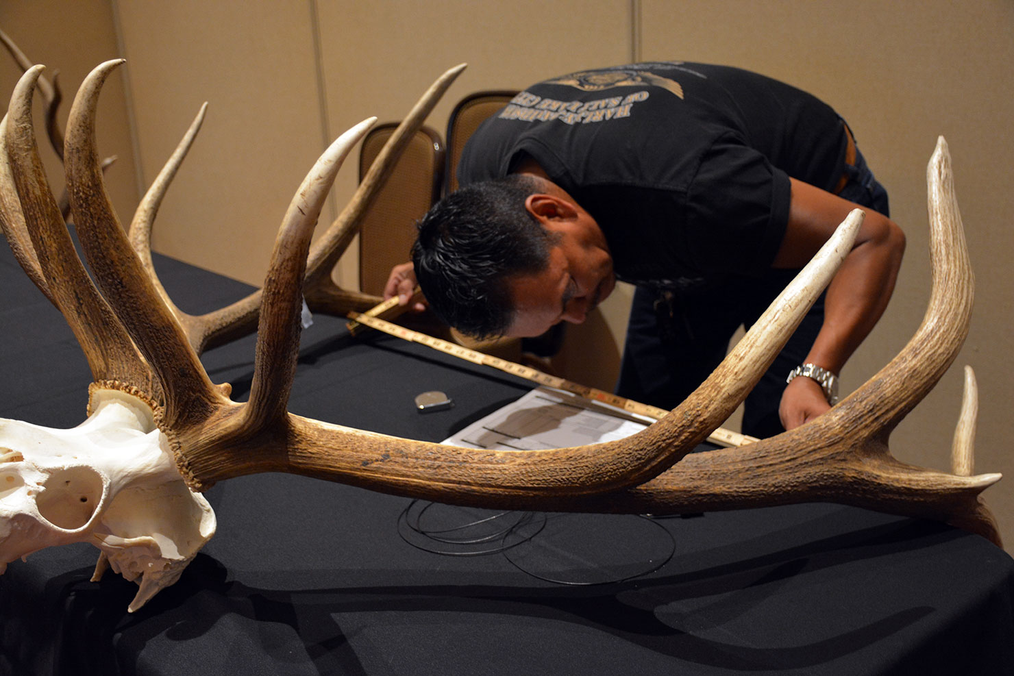 Jicarilla Apache tribal member and biology technician, Larson Panzy scores a bull elk rack. Official Boone & Crockett scorers from the Jicarilla Tribe assisted in measuring the racks. Joining Panzy were Kyle Tattor, Jicarilla Wildlife Biology Technician and Tom Watts, who is retired and an official scorer.