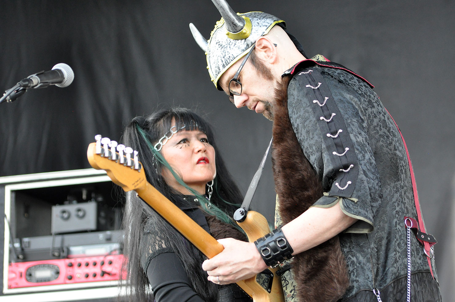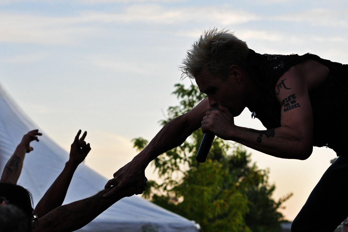 Greeting enthusiastic fans, lead vocalist Thunderwood of 9Electric gets the crowd pumped.