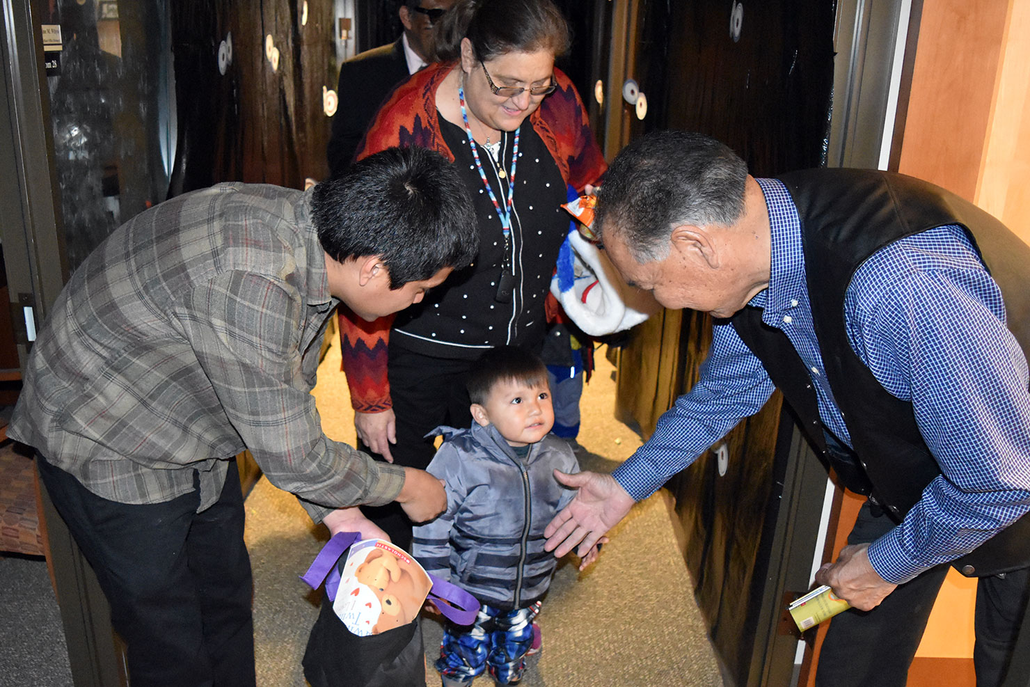 After receiving his book while trick or treating, Landon Miles shakes hands with Southern Ute Chairman, Clement J. Frost