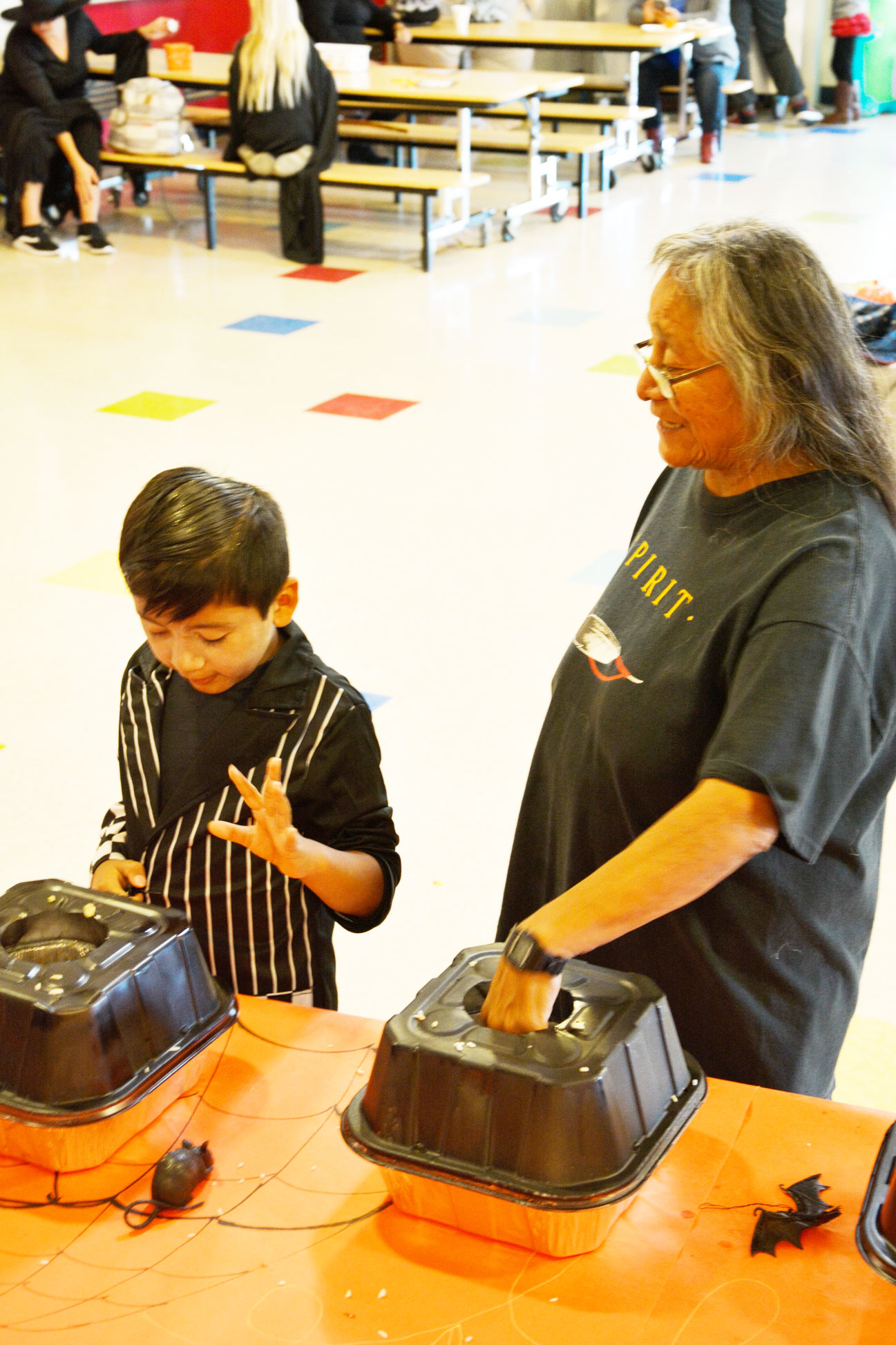 Faustino Ramos and his grandmother, Anne Weaver try to guess what’s in the containers.