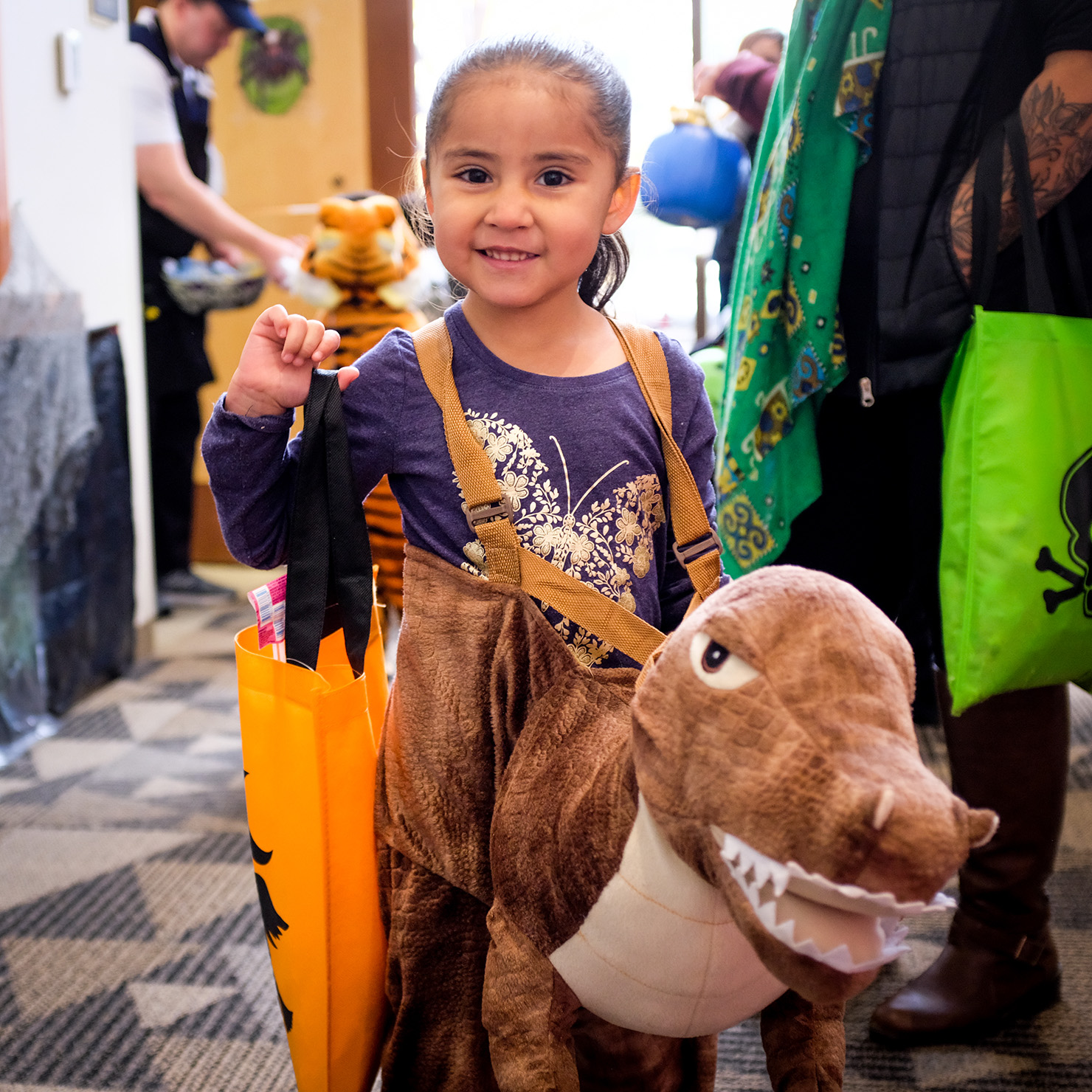 Dino riders seeking candy on campus, Tuesday, Oct. 31.