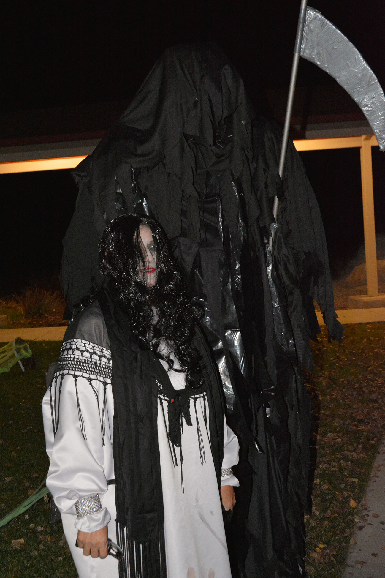 The witch and her grim reaper, await those trying to enter the haunted house.