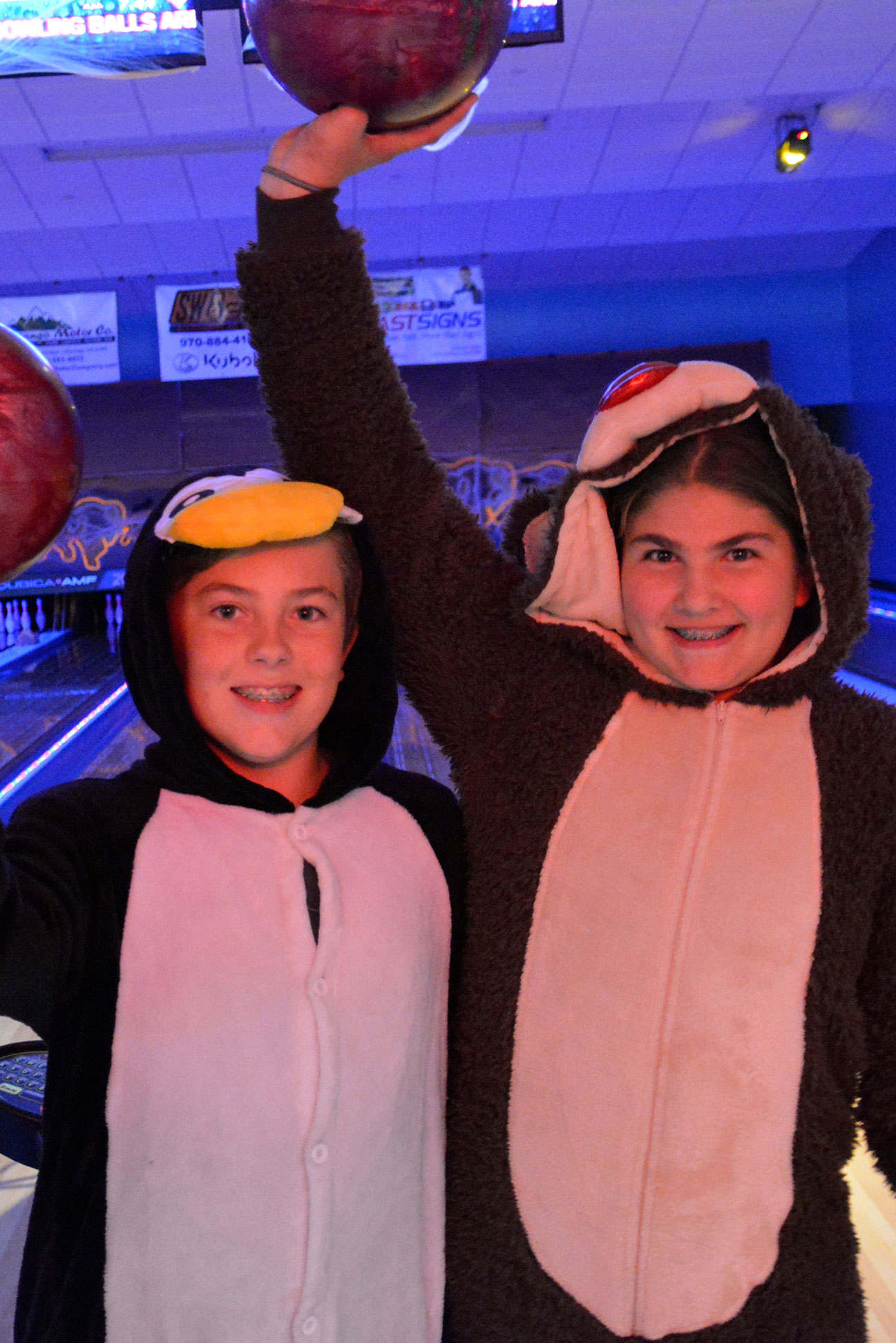 Penguin (Zander Berriman) and Bear (Alaysiah Kremer) compete against each other, not only on the lanes, but against each other in the costume contest.