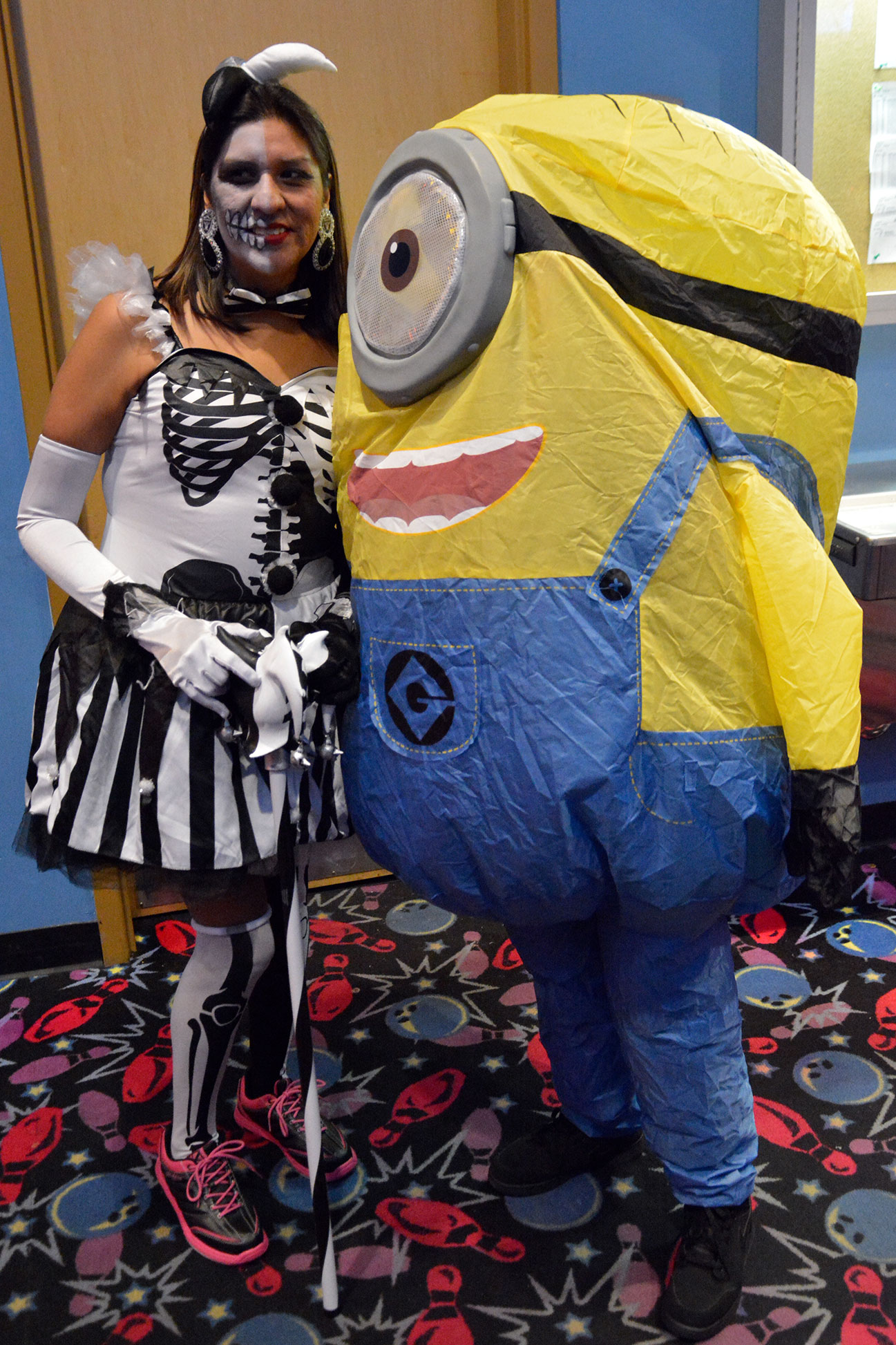 Minion and lil’ “Alvin” (AJ Hight) pose for a quick pic, during their bowling game. Minion however did win in the adult category of the costume contest.