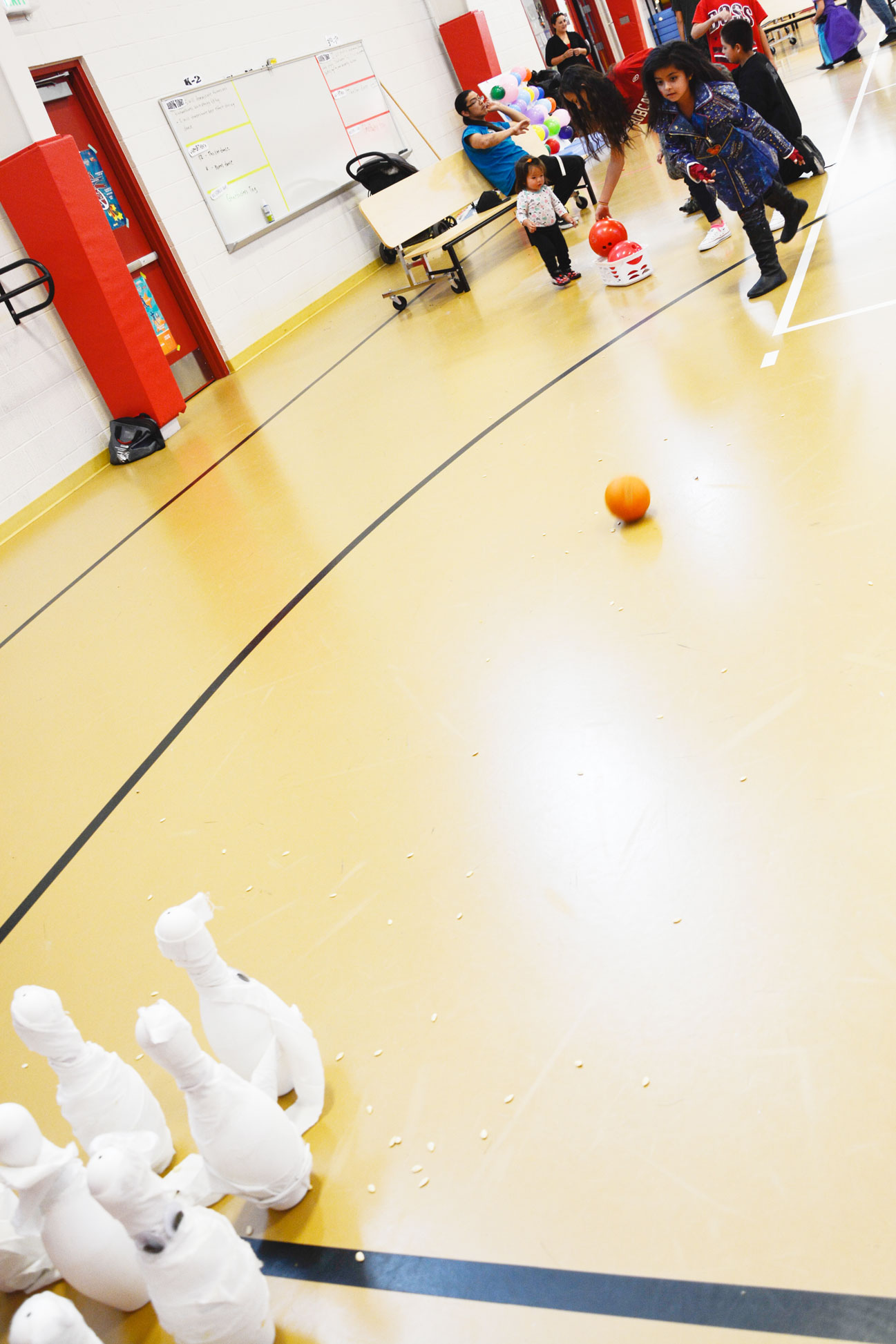 Ava Morgan gives her best roll during a pumpkin bowling game at the Ignacio Elementary Carnival.
